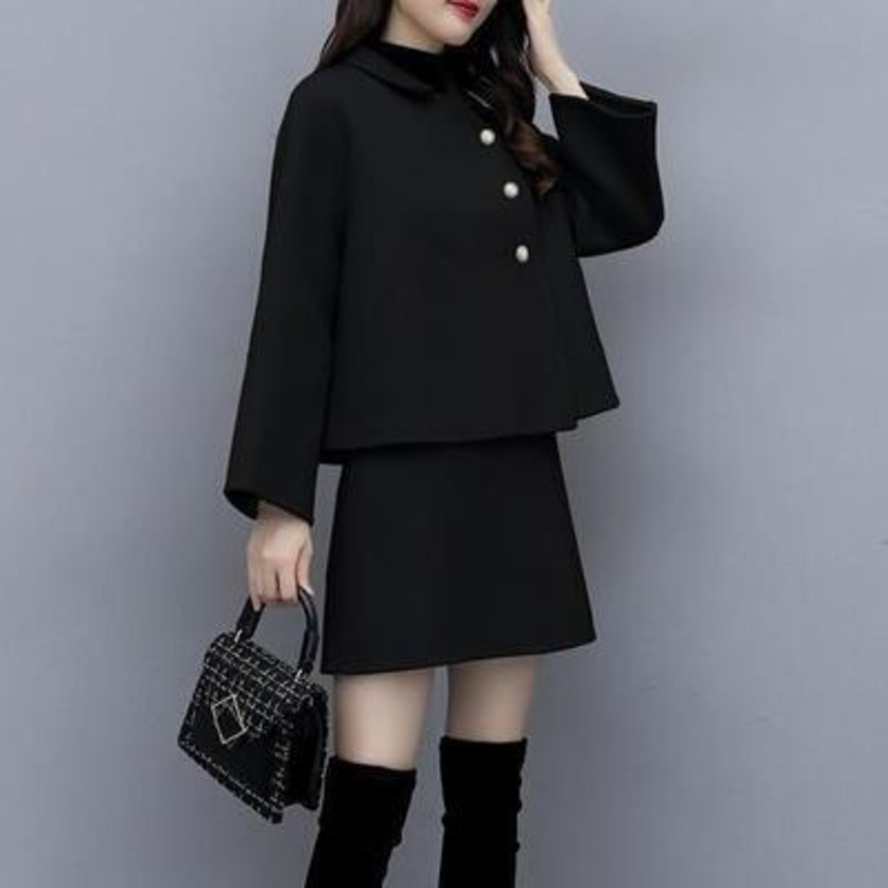 ビジューボタンがポイントのジャケット&ミニスカートのセットアップ。