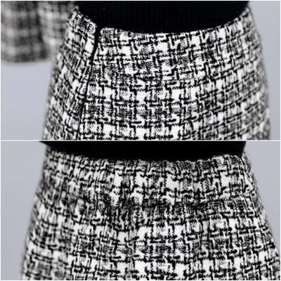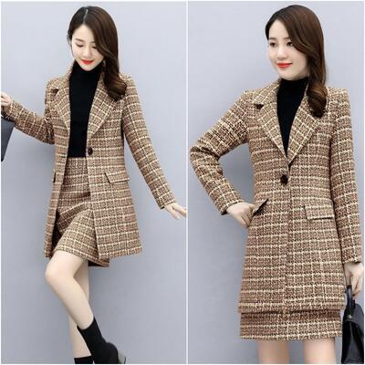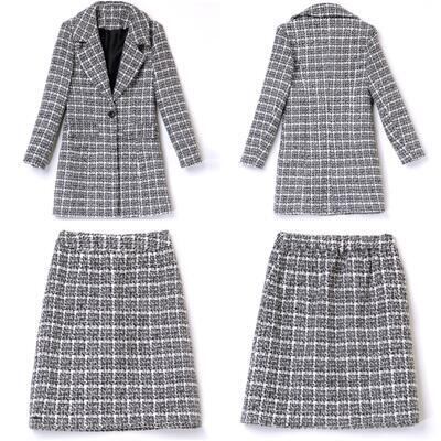 クラシカルなチェック柄のロングジャケットとミニスカートのセット。