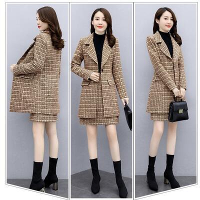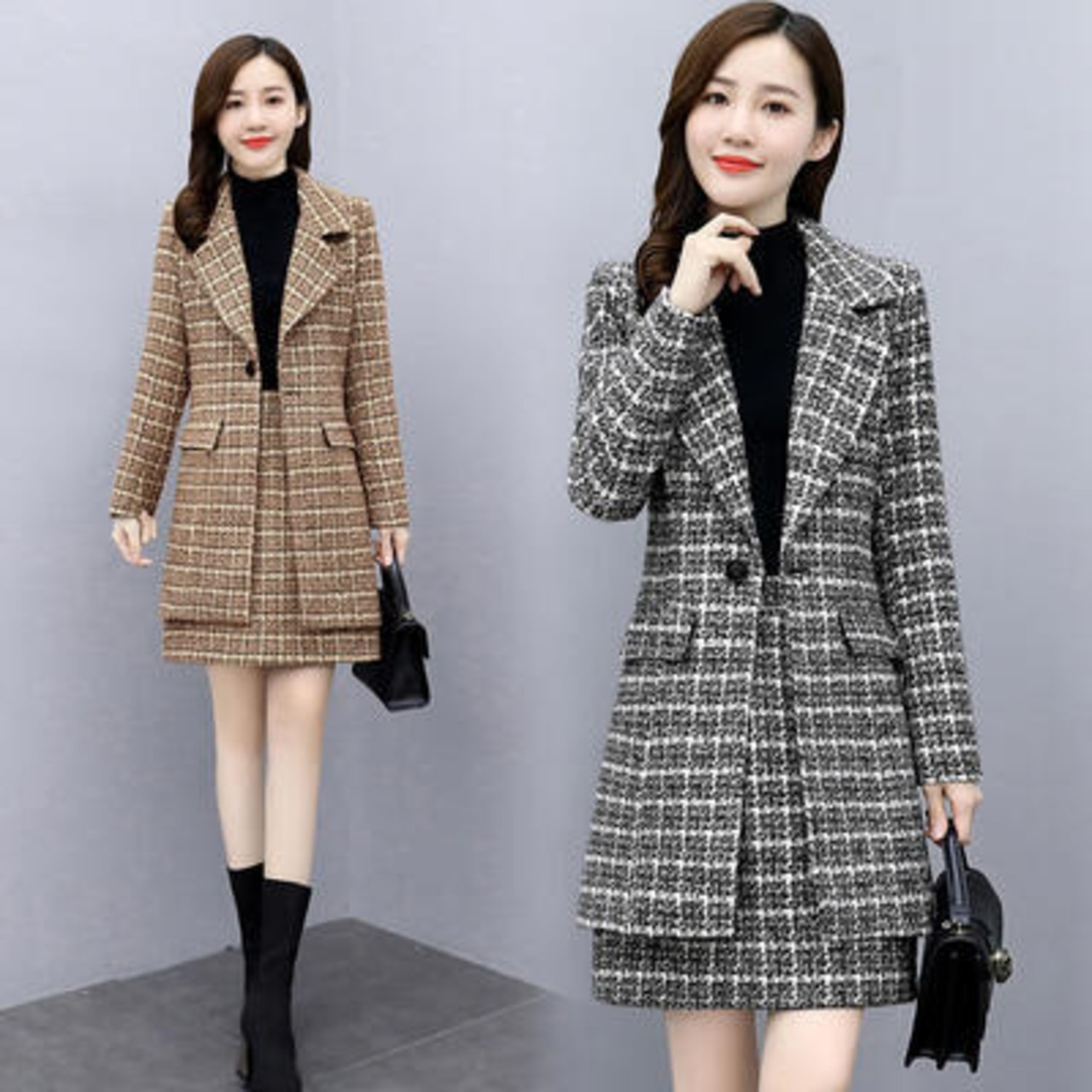 全2色 2点セット おしゃれ エレガント 大きいサイズ セットアップ ジャケット アウター ミニ スカート コート チェック柄 ひざ上丈 スーツ きれいめ カジュアル レディース 大人可愛い クラシカル ブラウン ブラック 黒 春 夏 秋 冬 20代 30代 40代 50代