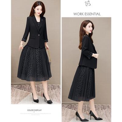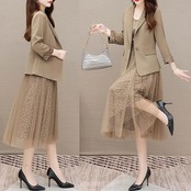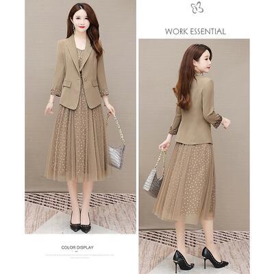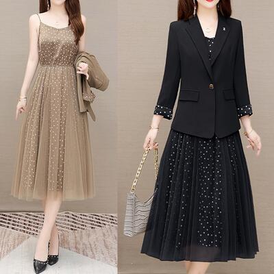 全2色 大きいサイズ 2点セット おしゃれ エレガント セットアップ ジャケット アウター ワンピース キャミソールワンピ ドット柄 チュール 七分袖 ミモレ丈 スーツ きれいめ カジュアル レディース 大人可愛い お呼ばれ ブラック 黒 ブラウン 春 夏 秋 冬 20代 30代 40代 50代