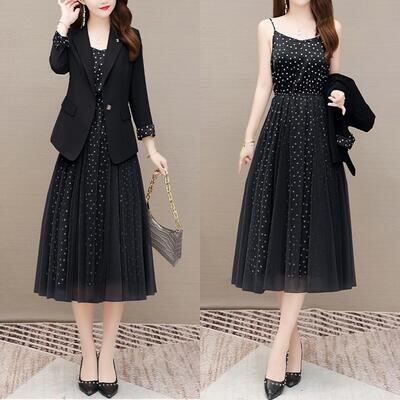 ドット柄が大人かわいいジャケット&キャミソールワンピースのセット。