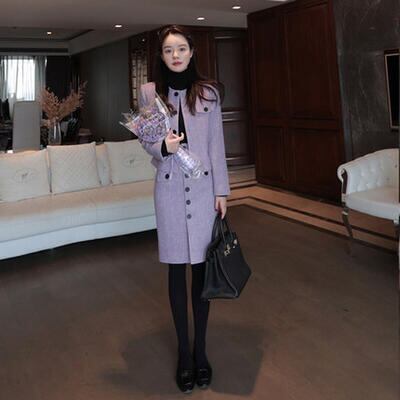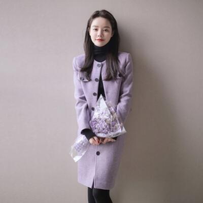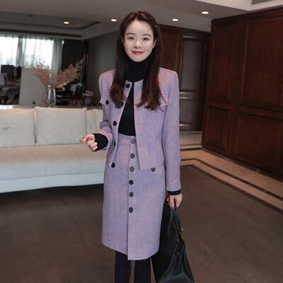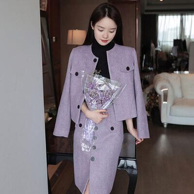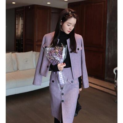 大きいサイズ 2点セット 大人可愛い おしゃれ セットアップ ジャケット アウター スカート ノーカラー 長袖 ひざ丈 スーツ きれいめ カジュアル レディース エレガント シンプル タイト フロントボタン 通勤 お呼ばれ パープル 春 秋 冬 20代 30代 40代 50代