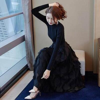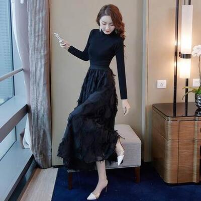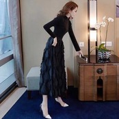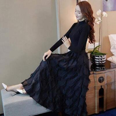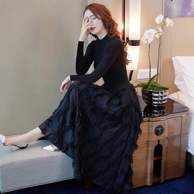 セットアップ 2点セット ニット トップス ハイネック スカート 長袖 ミモレ丈 カットソー ロングスカート きれいめ カジュアル レディース 大人可愛い かっこいい エレガント モード 大きいサイズ ブラック 黒 春 秋 冬 20代 30代 40代 50代