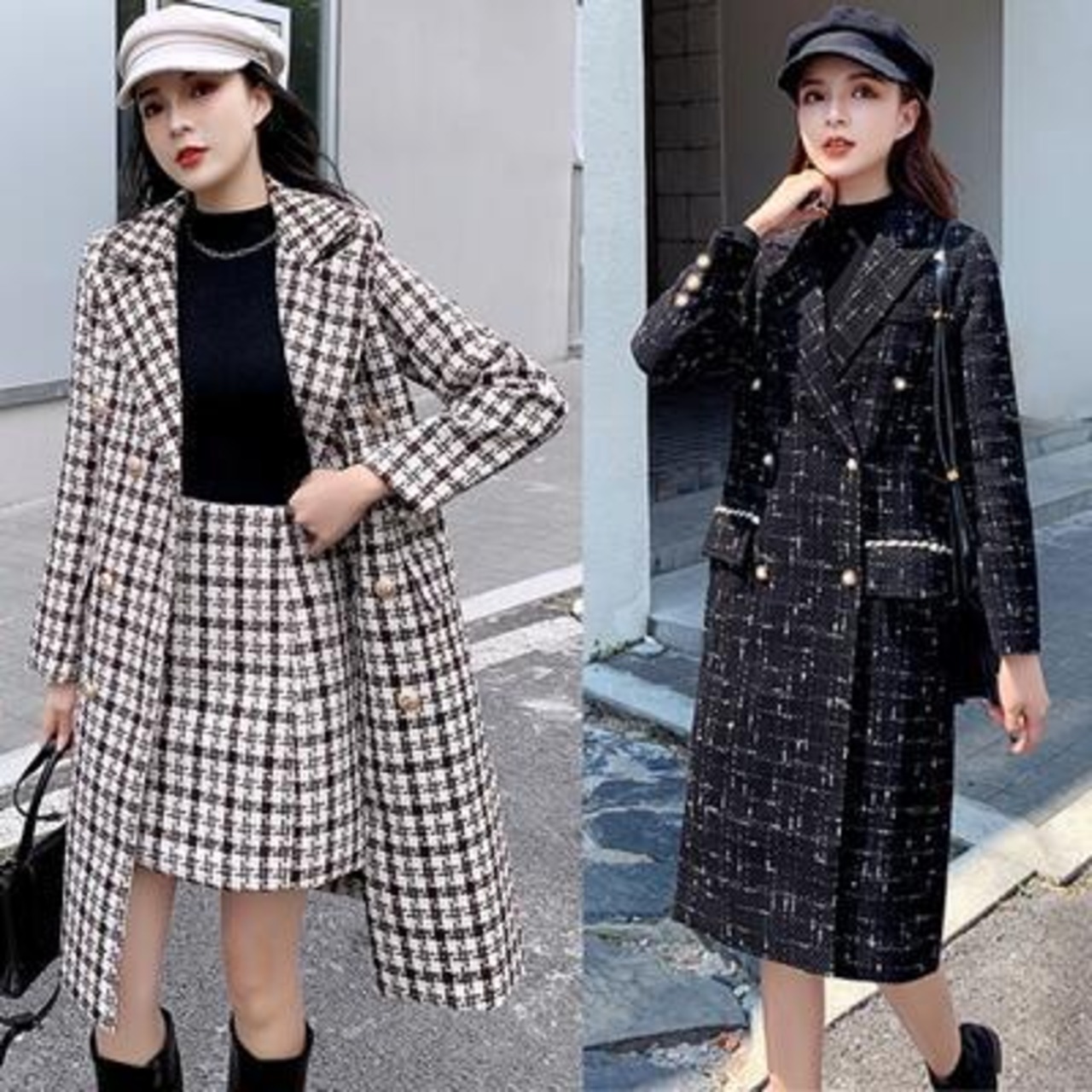 クラシカルな雰囲気のジャケットコートとミニスカートのセット。