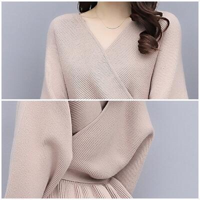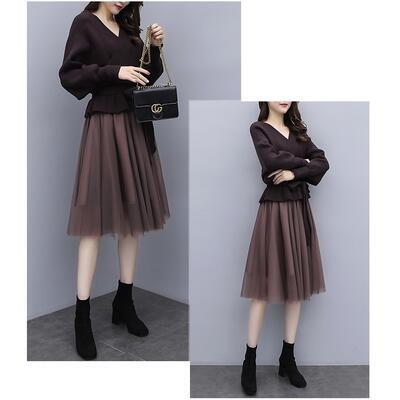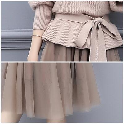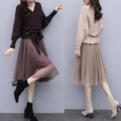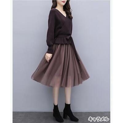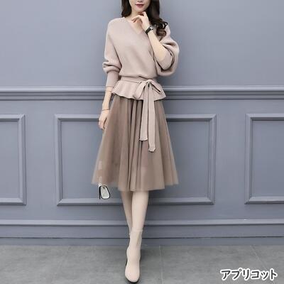 全2色 大きいサイズセットアップ 2点セット ニット カシュクール トップス スカート チュール ミモレ丈 Vネック 長袖 パフスリーブ おしゃれ きれいめ カジュアル レディース 大人可愛い ウエストリボン ウエストゴム ベージュ ブラウン 春 秋 冬 20代 30代 40代 50代