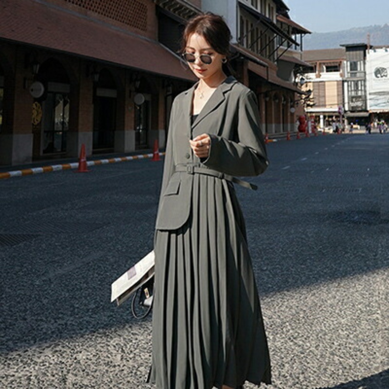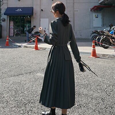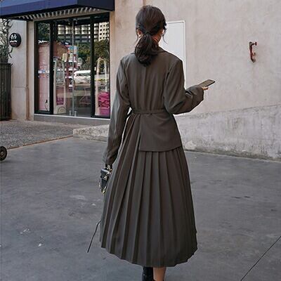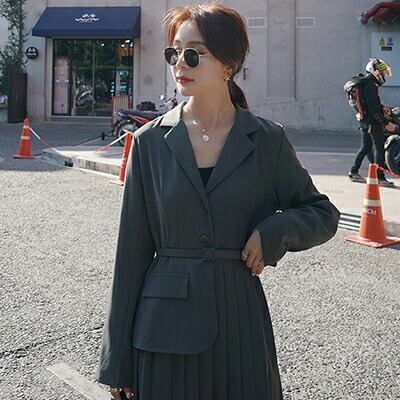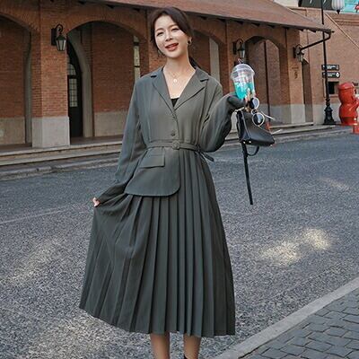 全2色 大きいサイズ 2点 おしゃれ ゆったりワンピース 長袖 ミモレ丈 きれいめ カジュアル ジャケット風 プリーツ レディース フェミニン 大人可愛い ブラック グレー お呼ばれ オフィス 通勤着 ウエストベルト 春 夏 秋 冬 20代 30代 40代 50代