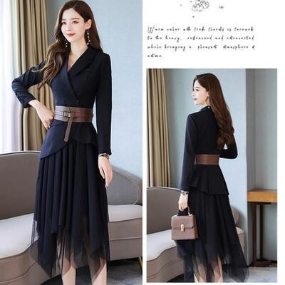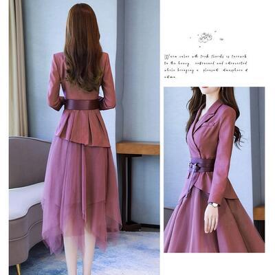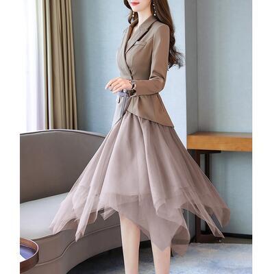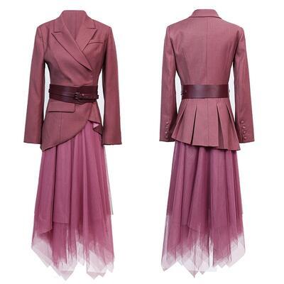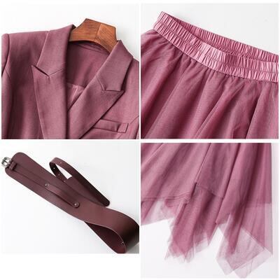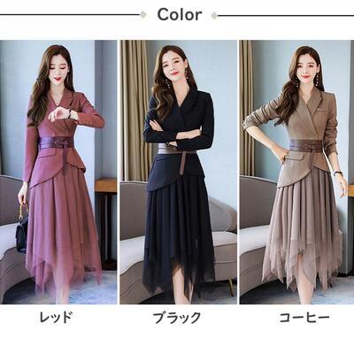 全3色 大きいサイズセットアップ 2点セット テーラードジャケット スカート スーツ チュール ミモレ丈 アシンメトリー 長袖 おしゃれ きれいめ カジュアル エレガント レディース ウエストベルト お呼ばれ レッド 赤 カーキ ブラック 黒 春 秋 冬 20代 30代 40代 50代