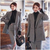 トラッドな雰囲気のテーラードジャケットとスカートのセットアップ。