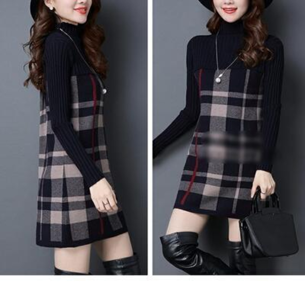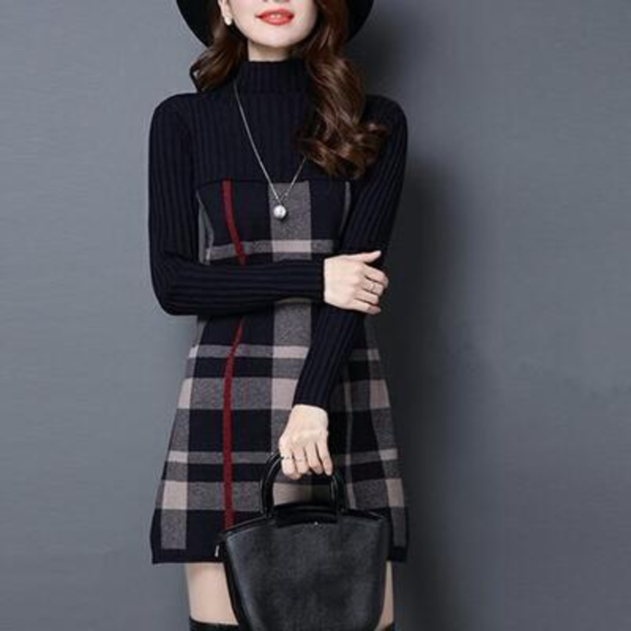 全4色 大きいサイズニット ワンピース ショートワンピ 切り替え チェック ハイネック ミニワンピ きれいめ カジュアル エレガント 長袖 レディース ワンピ ドレス 大人可愛い フェミニン ネイビー レッド 赤 ブラック 黒 カーキ 春 秋 冬 20代 30代 40代 50代