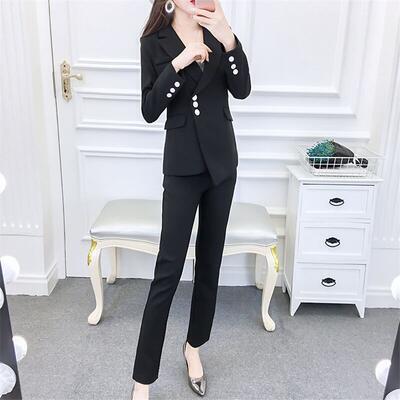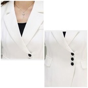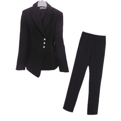アシンメトリーなデザインのジャケット&パンツのスーツ。