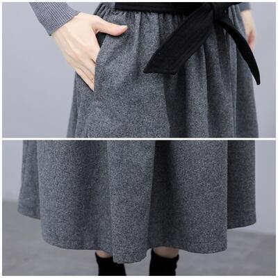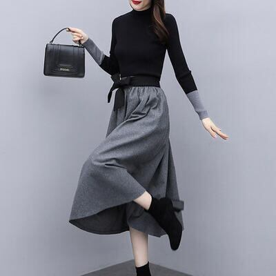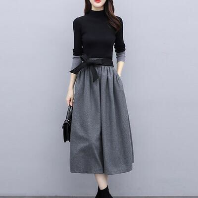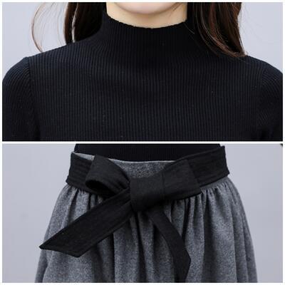セットアップ 2点セット ニット トップス ハイネック スカート ウエストリボン ミモレ丈 配色 切り替え 長袖 おしゃれ きれいめ 大人可愛い エレガント カジュアル フェミニン フレア 大きいサイズ グレー ブラック 黒 春 秋 冬 20代 30代 40代 50代