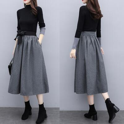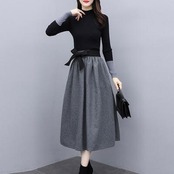 ハイネックニットとフレアスカートのセットアップ。