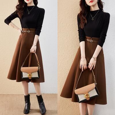 ワンピース セパレート風 ワンピース ハイウエスト ミモレ丈 モックネック きれいめ カジュアル エレガント 長袖 レディース ワンピ ドレス ひざ丈 大人可愛い フェミニン 大きいサイズ オフィス ブラック 黒 ブラウン 春 秋 冬 20代 30代 40代 50代