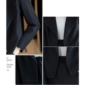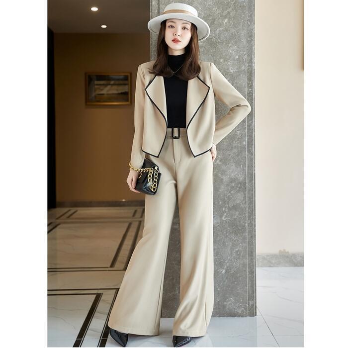 黒のパイピングがアクセントになったジャケット&パンツのセットアップ。