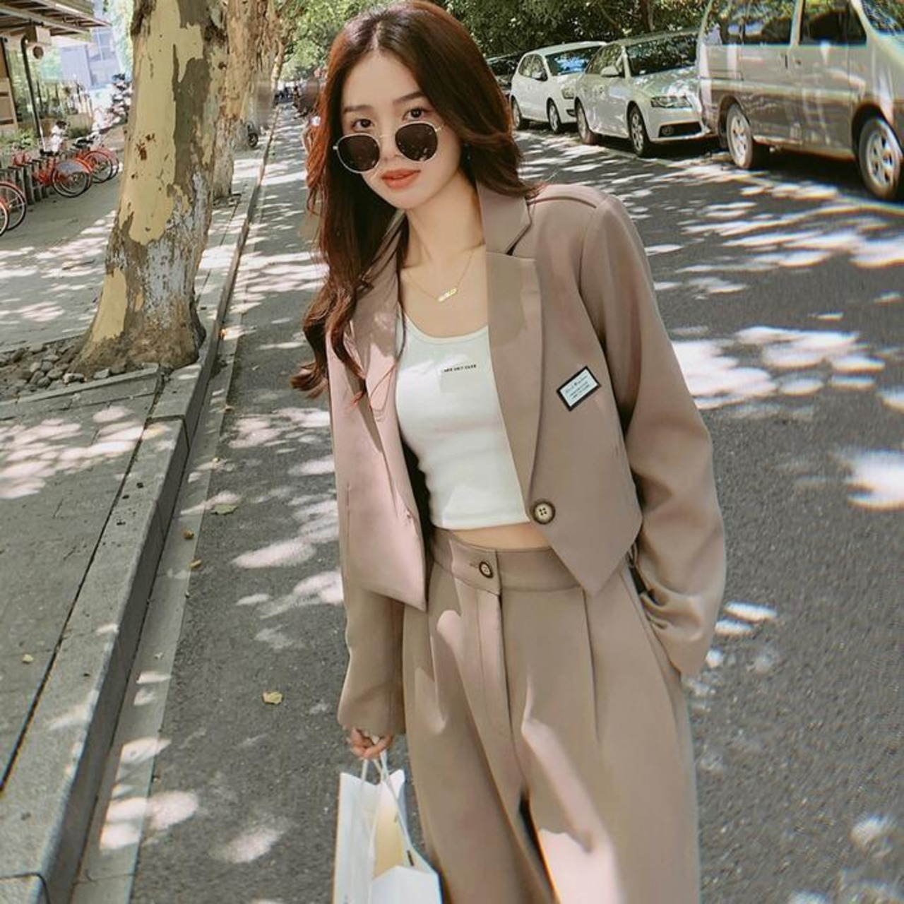 1つボタンのショート丈ジャケット&パンツのセットアップ。