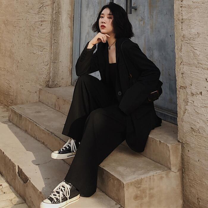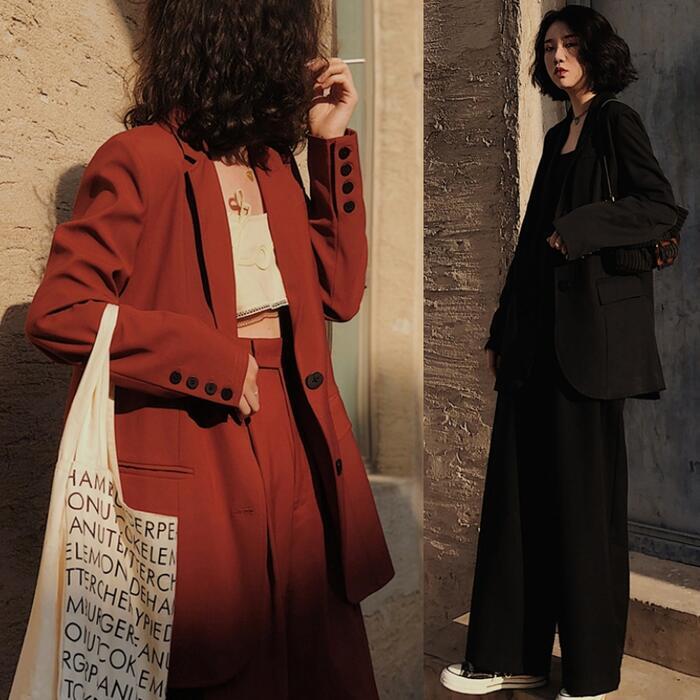 全2色 大きいサイズセットアップ 2点セット スーツ ジャケット アウター パンツ ワイドレッグ 長袖 ロング丈 ロングパンツ おしゃれ きれいめ 大人可愛い エレガント カジュアル フェミニン かっこいい ゆったり ブラック 黒 レッド 赤 春 夏 秋 冬 20代 30代 40代 50代
