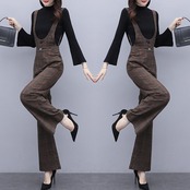 ベルスリーブのハイネックニット&サロペットパンツのセット。