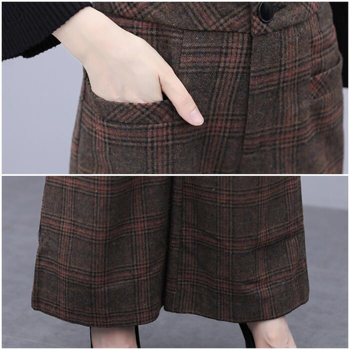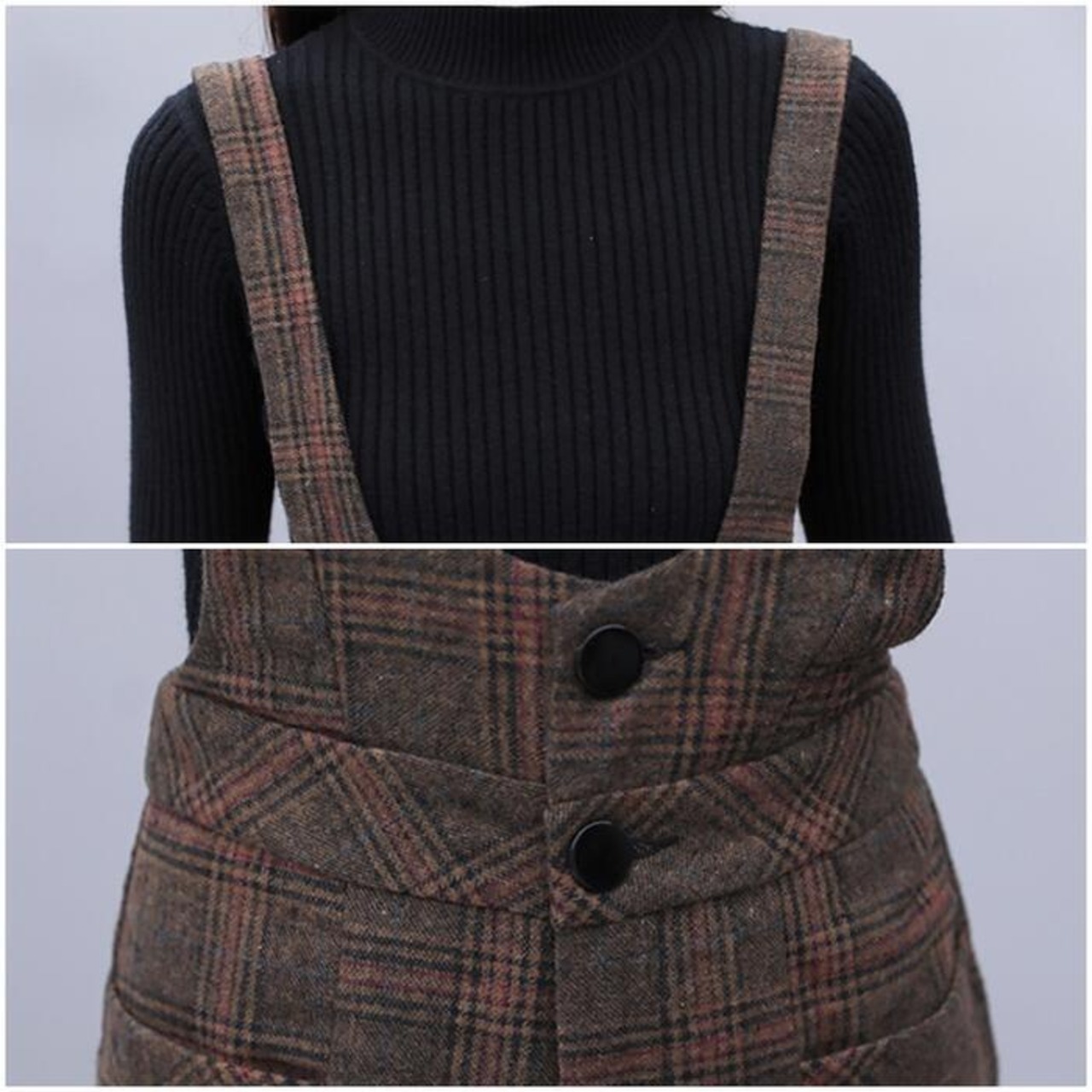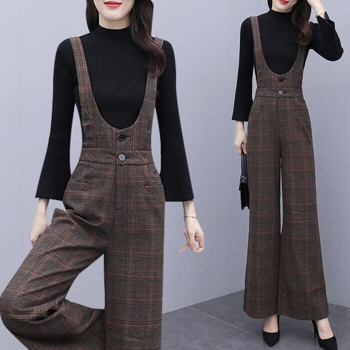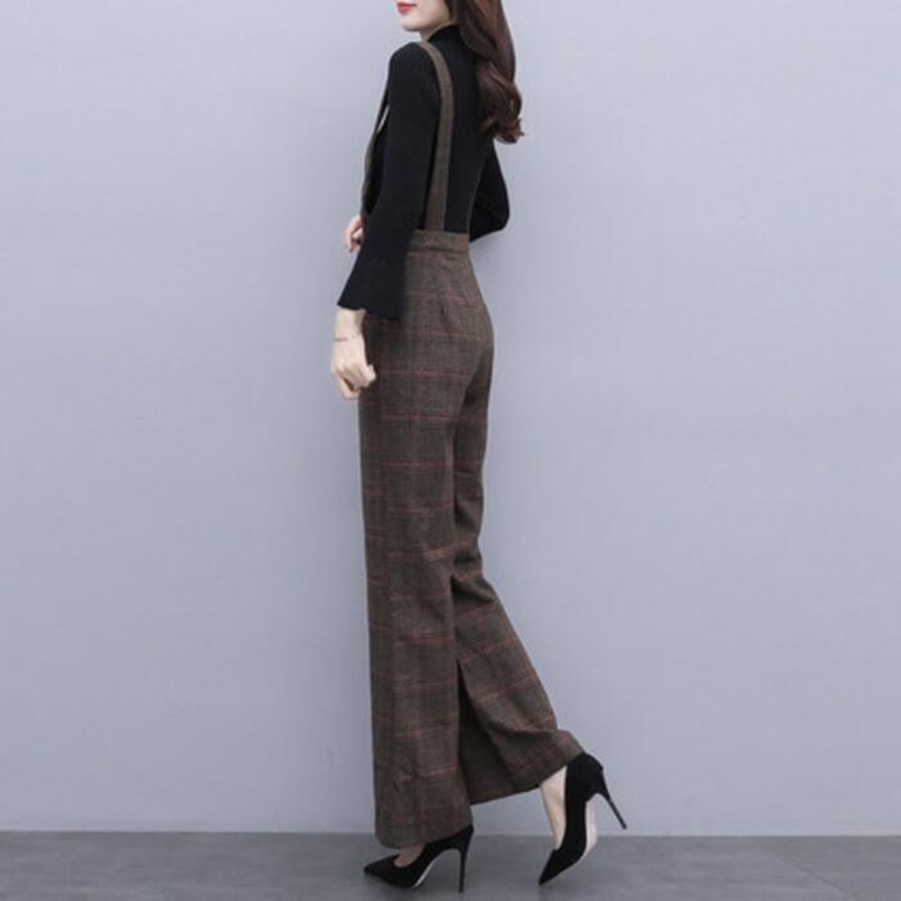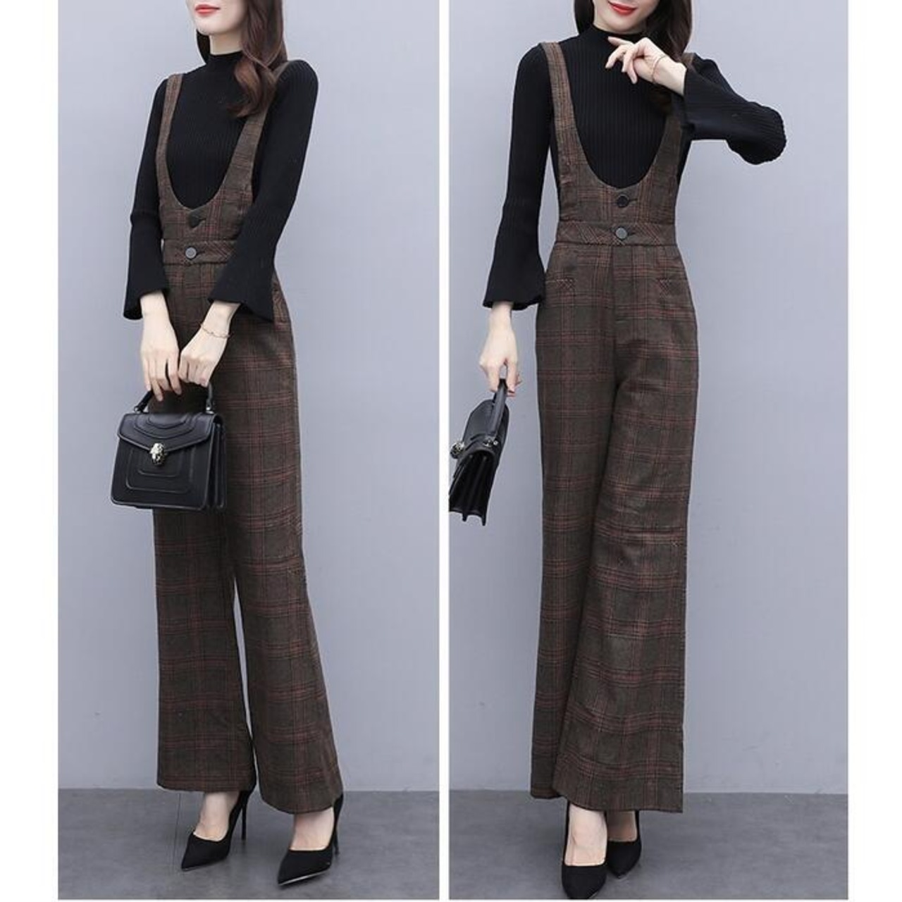 大きいサイズセットアップ 2点セット ニット ハイネック ベルスリーブ サロペットパンツ チェック柄 パンツ ワイドレッグ 長袖 おしゃれ きれいめ 大人可愛い レトロ カジュアル フェミニン かっこいい ブラック 黒 ブラウン 春 夏 秋 冬 20代 30代 40代 50代