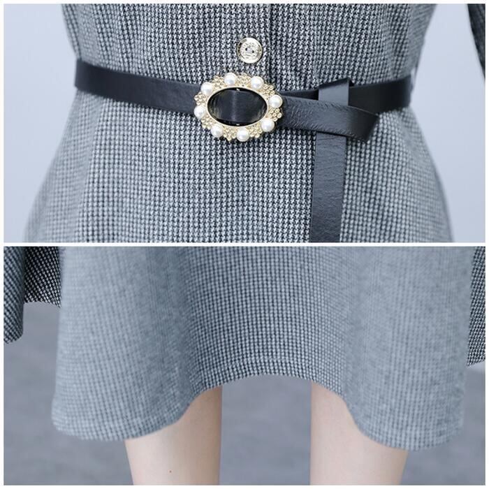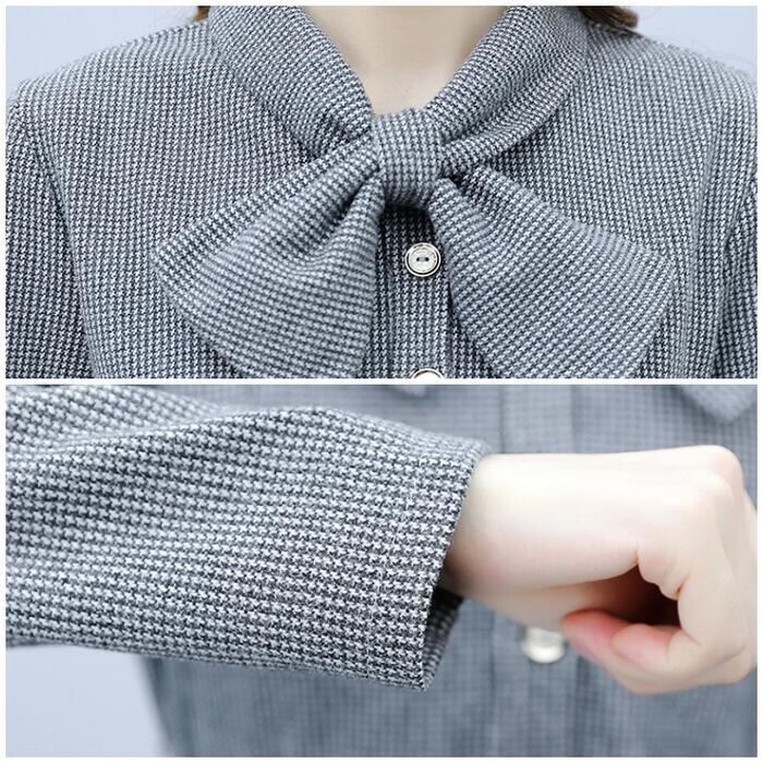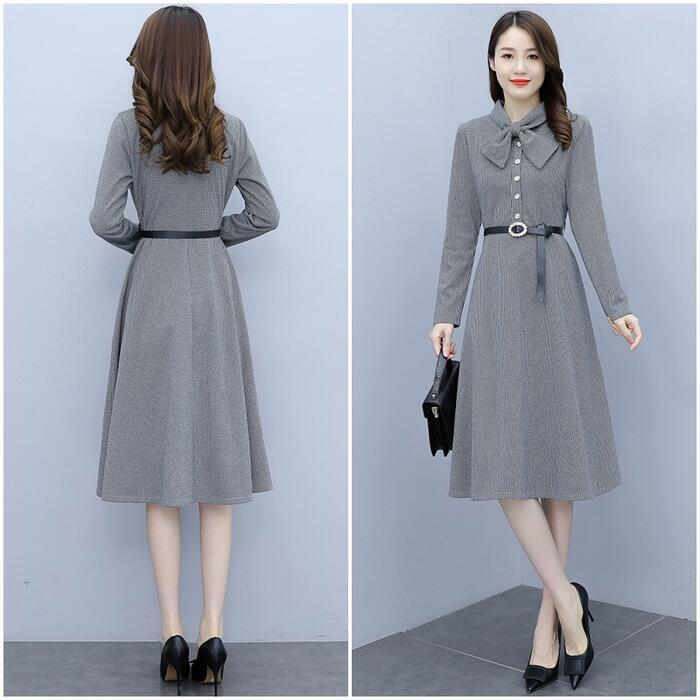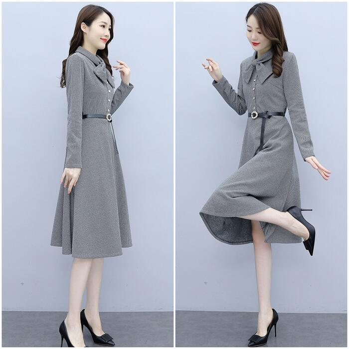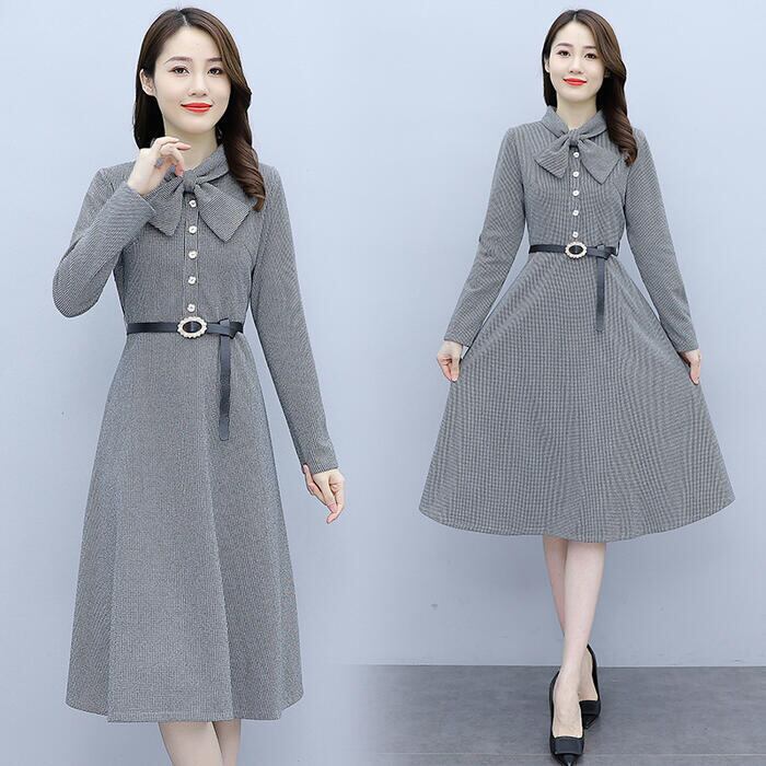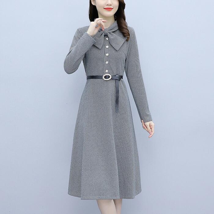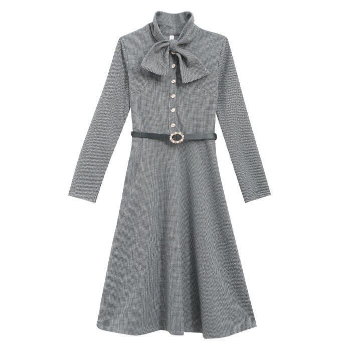 ワンピース ロングワンピ リボン襟 千鳥格子 ミモレ丈 きれいめ カジュアル レディース ワンピ ドレス 長袖 エレガント フェミニン 大人可愛い Aライン ウエストベルト 通勤 オフィス 大きいサイズ 春 秋 冬 20代 30代 40代 50代