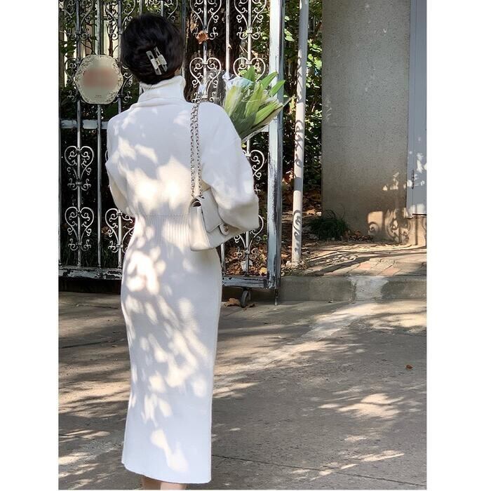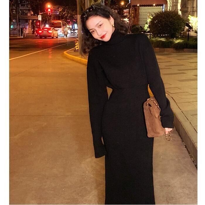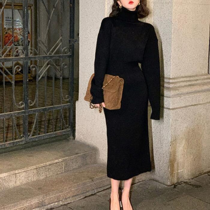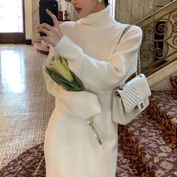 全2色 大きいサイズニット ワンピース ロングワンピ ミモレ丈 タートルネック きれいめ カジュアル レディース ワンピ ドレス 長袖 エレガント フェミニン 大人可愛い タイト シンプル ベーシック ハイウエスト ホワイト 白 ブラック 黒 春 秋 冬 20代 30代 40代 50代