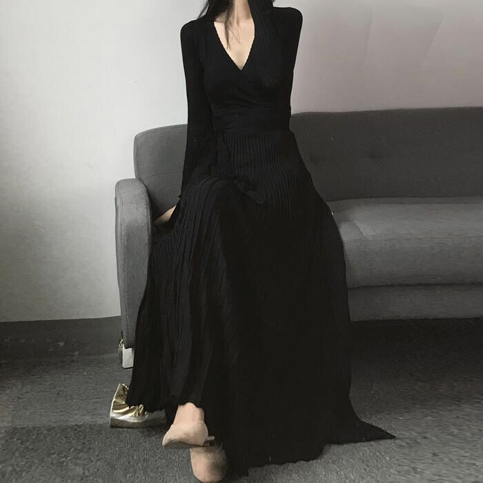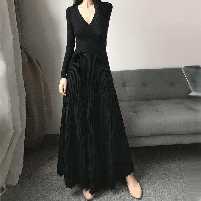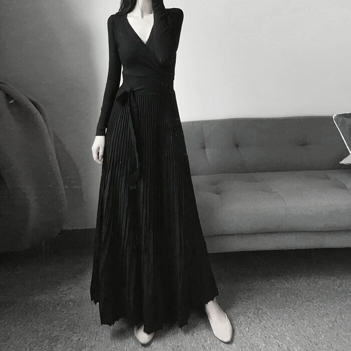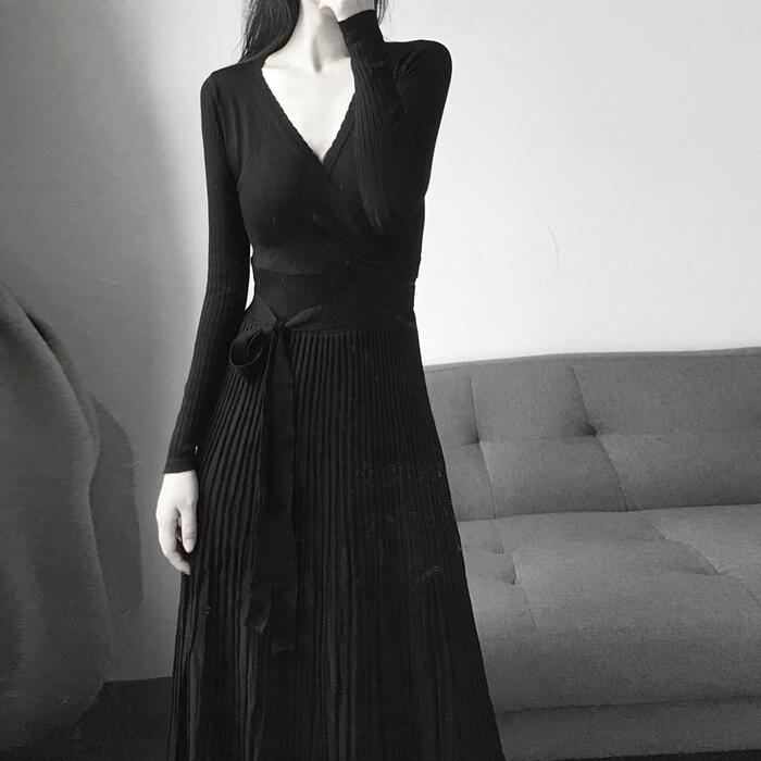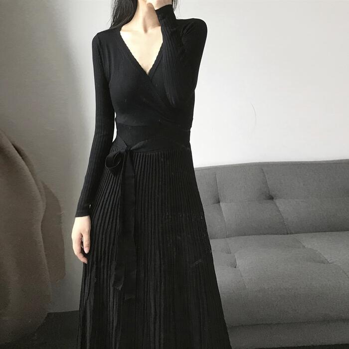 ニット ワンピース ロングワンピ マキシ丈 Vネック きれいめ カジュアル レディース ワンピ ドレス 長袖 エレガント フェミニン 大人可愛い プリーツ ウエストリボン ハイウエスト ブラック 黒 春 秋 冬 20代 30代 40代 50代