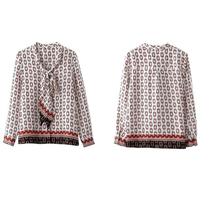 チェーン柄が上品クラシカルなリボンタイブラウス。