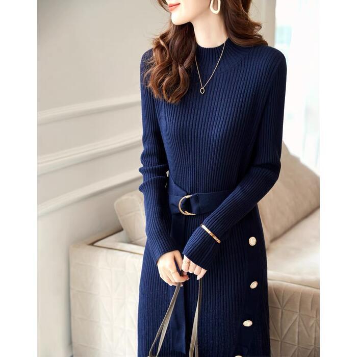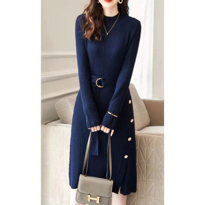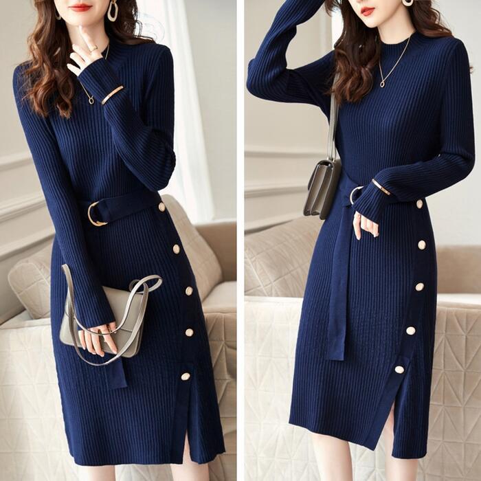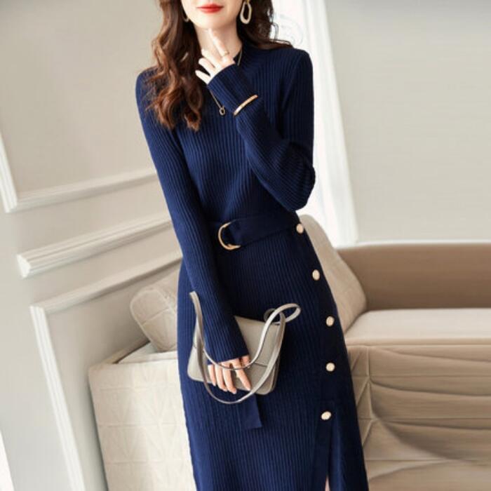 ニット ワンピース ロングワンピ ミモレ丈 きれいめ カジュアル レディース ワンピ ドレス 長袖 エレガント フェミニン 大人可愛い ハイウエスト タイト スリム シンプル ウエストベルト 大きいサイズ ネイビー 春 秋 冬 20代 30代 40代 50代