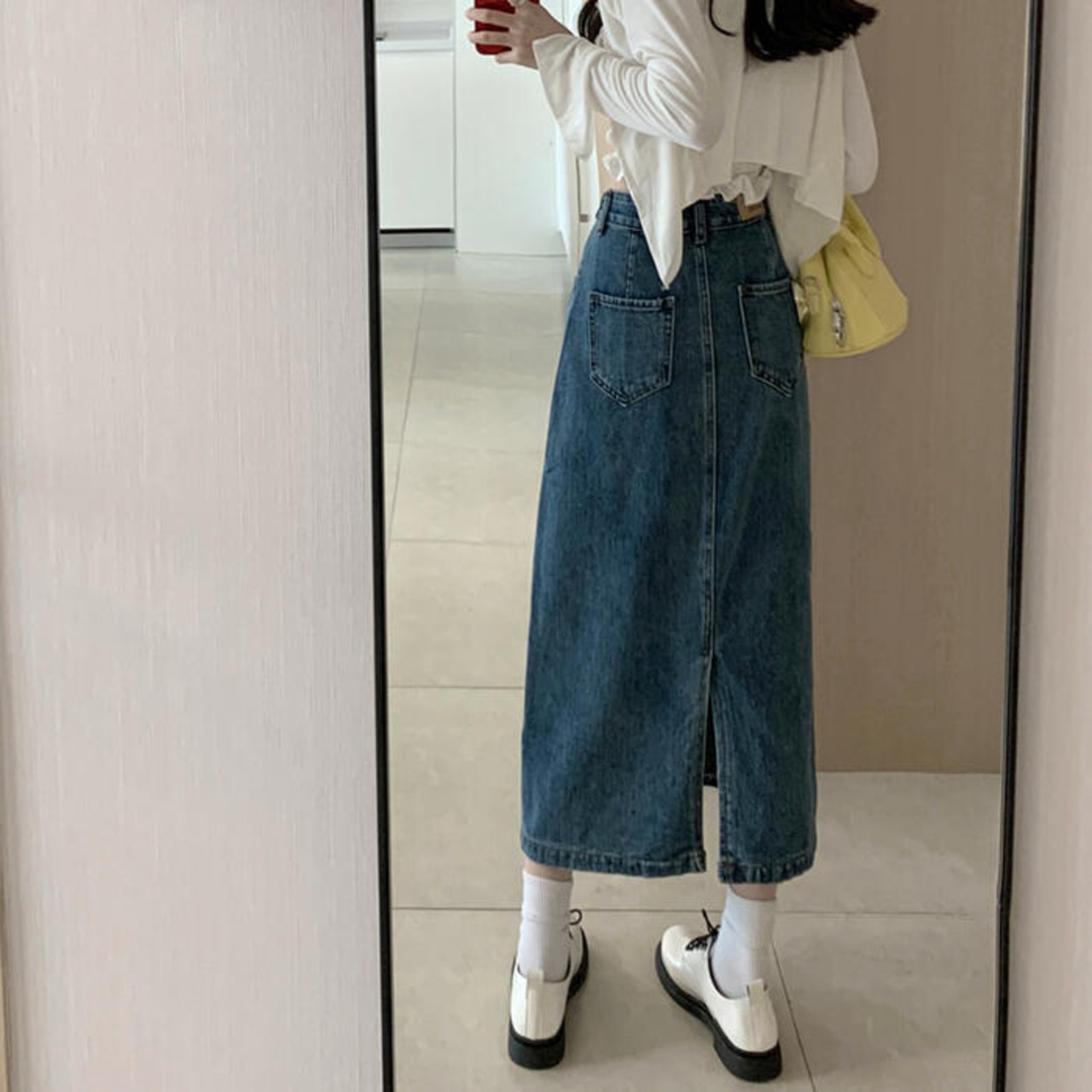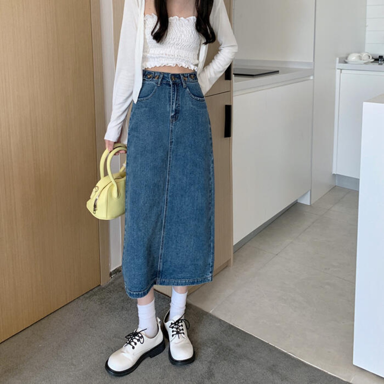 ストンとしたシルエットのデニムタイトスカート。