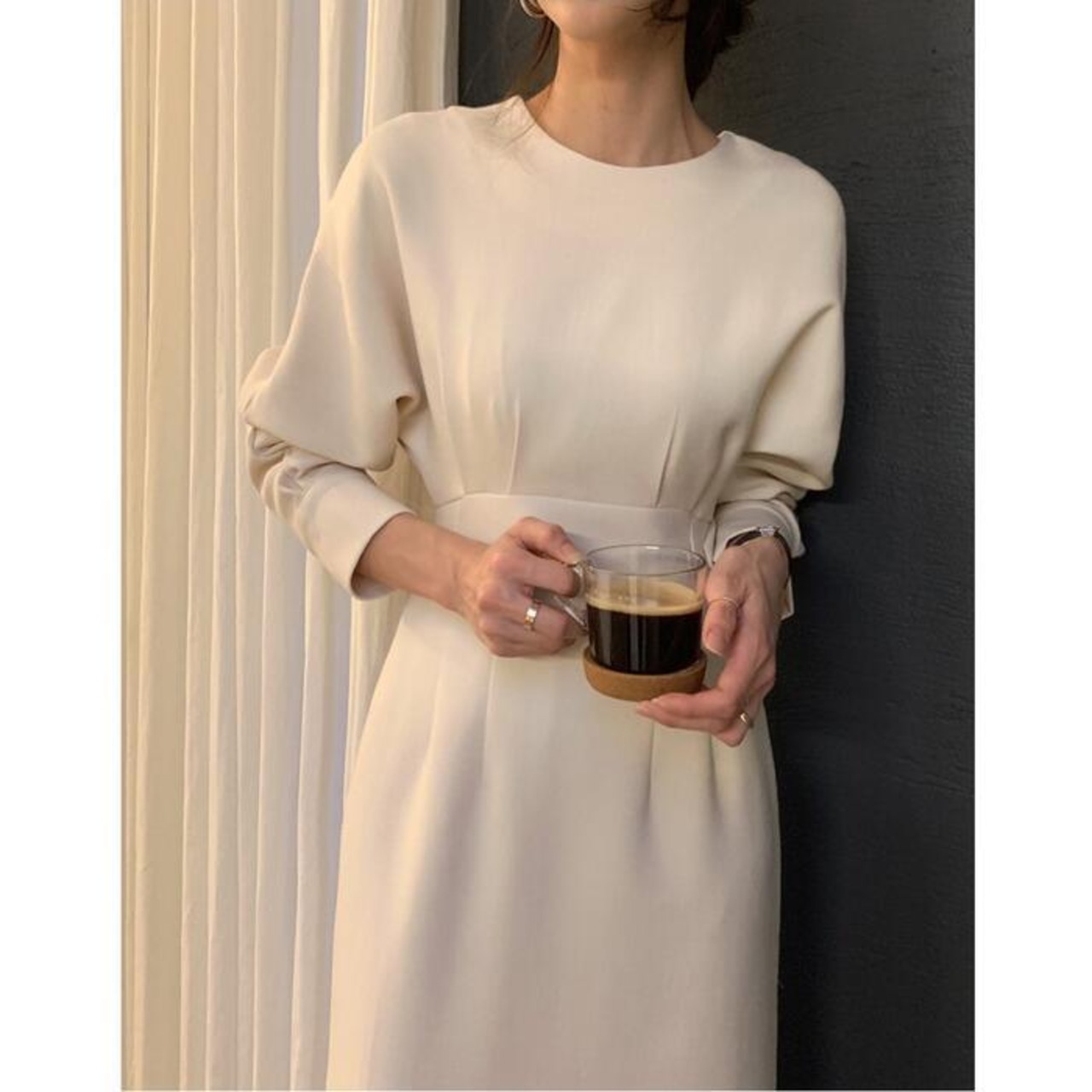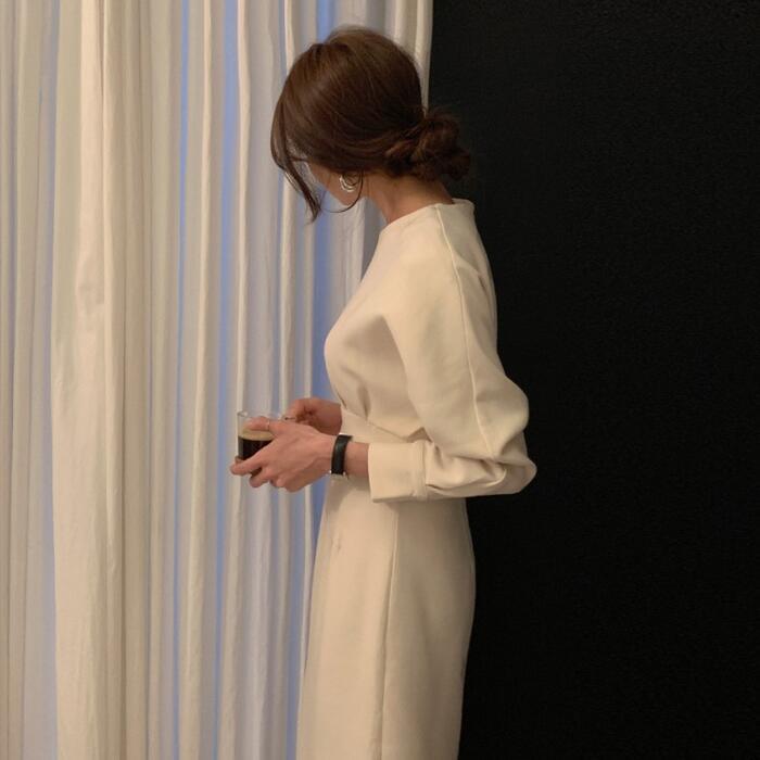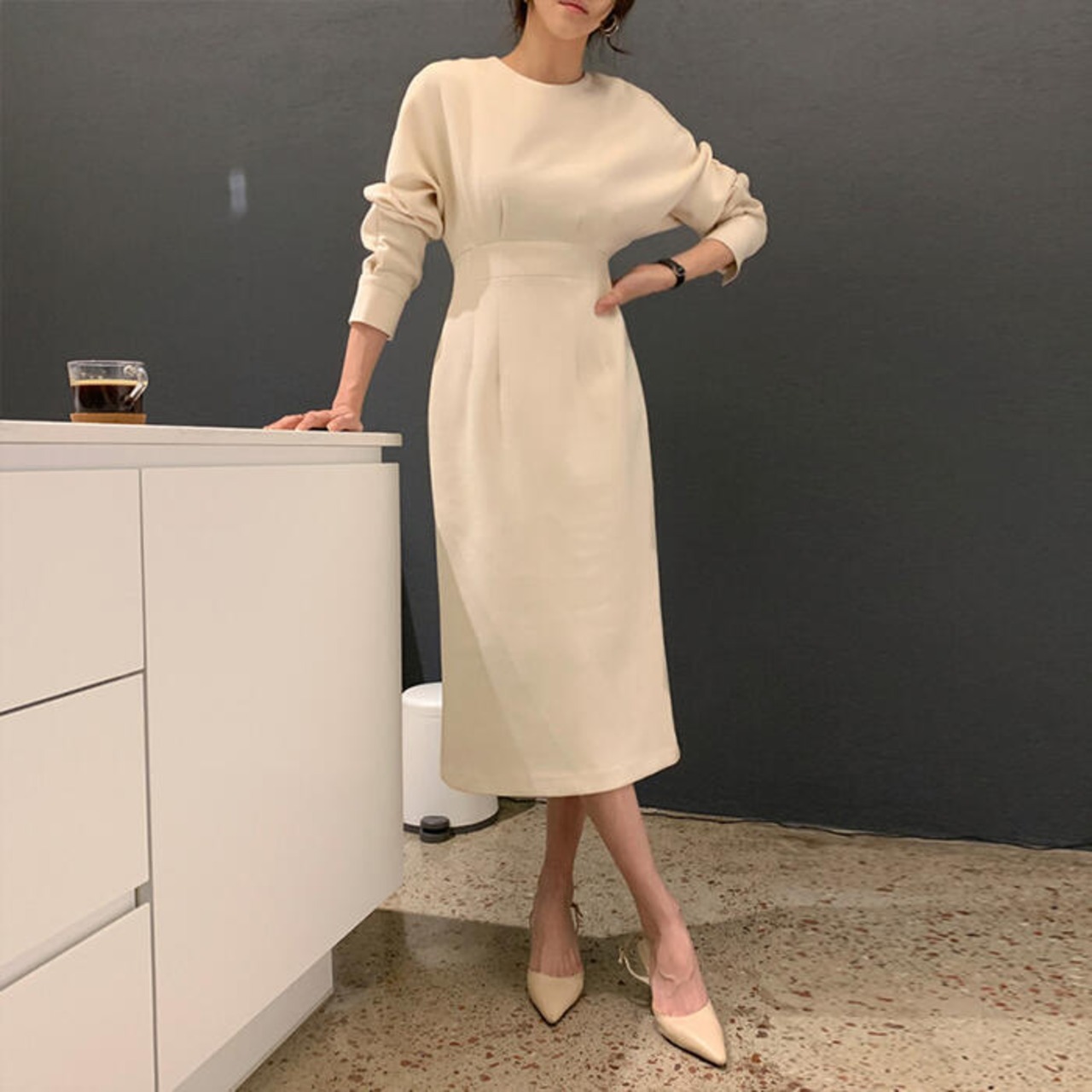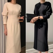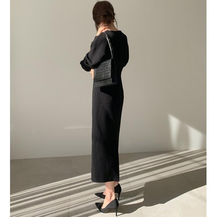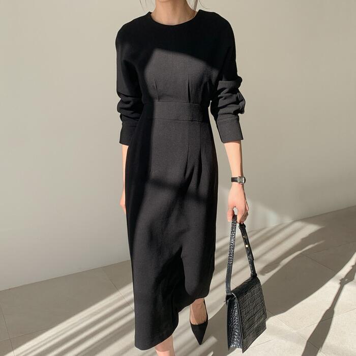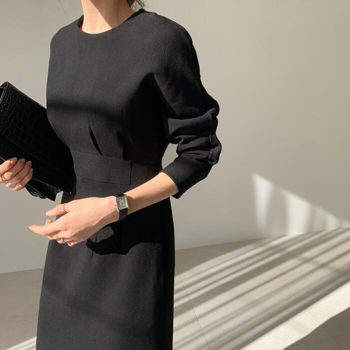 全3色 袖コンシャス ワンピース ロングワンピ ミモレ丈 きれいめ カジュアル レディース ワンピ ドレス 長袖 エレガント おしゃれ ハイウエスト 切り替え 大人可愛い シンプル フォーマル ブラック 黒 ベージュ 春 秋 冬 20代 30代 40代 50代