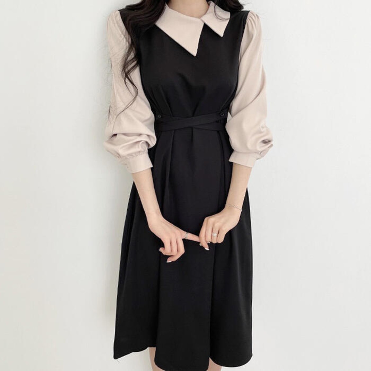 レイヤード風 ワンピース ロングワンピ ミモレ丈 パフスリーブ きれいめ カジュアル レディース ワンピ ドレス 長袖 エレガント おしゃれ ハイウエスト ウエストリボン 大人可愛い シンプル お呼ばれ ブラック 黒 春 秋 冬 20代 30代 40代 50代