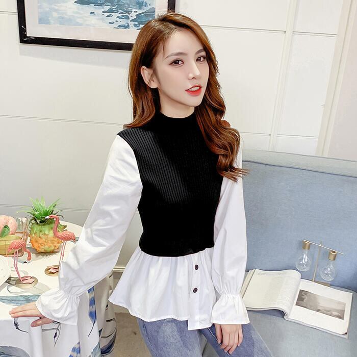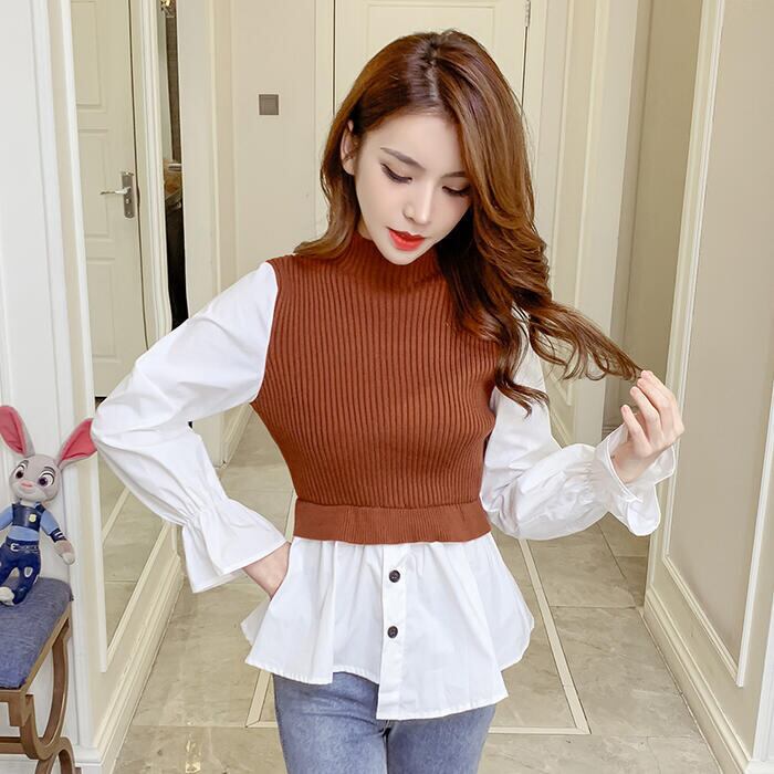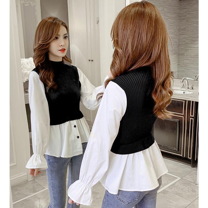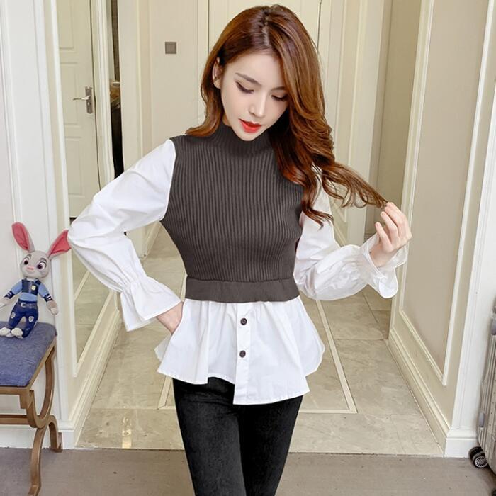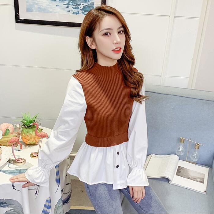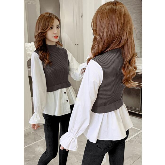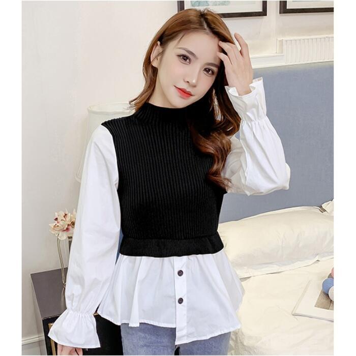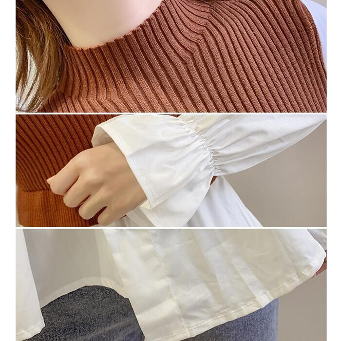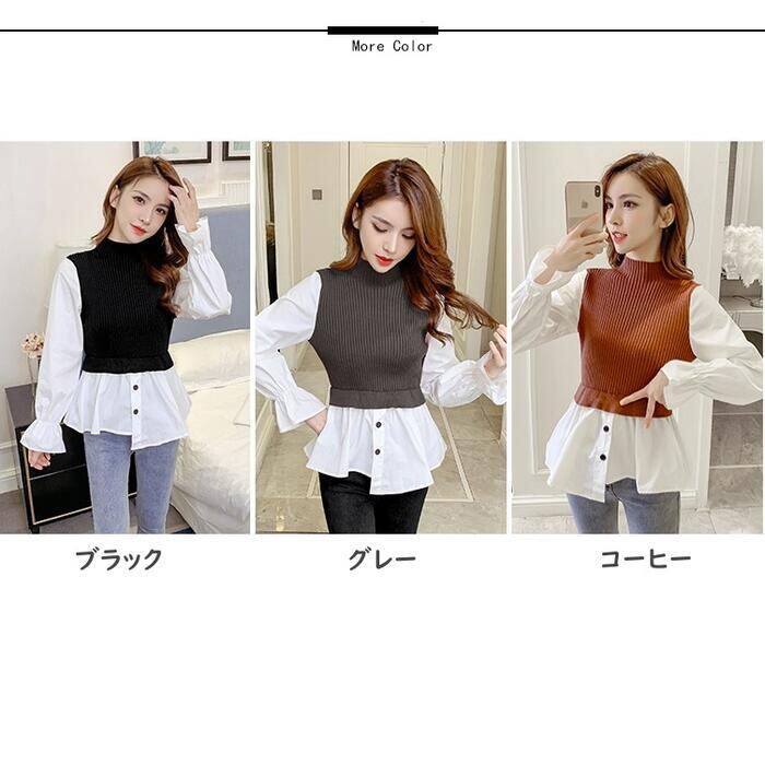 全3色 大きいサイズレイヤード風 トップス モックネック ニット シャツ ブラウス ドッキング レディース きれいめ カジュアル おしゃれ 長袖 アシンメトリー ハイネック 異素材MIX キャンディスリーブ ブラウン ブラック 黒 グレー 春 秋 冬 20代 30代 40代 50代