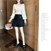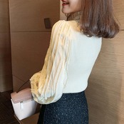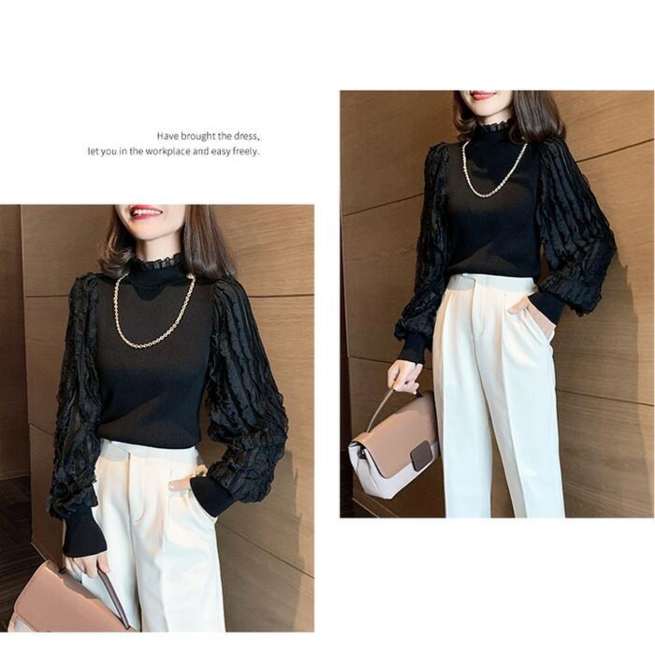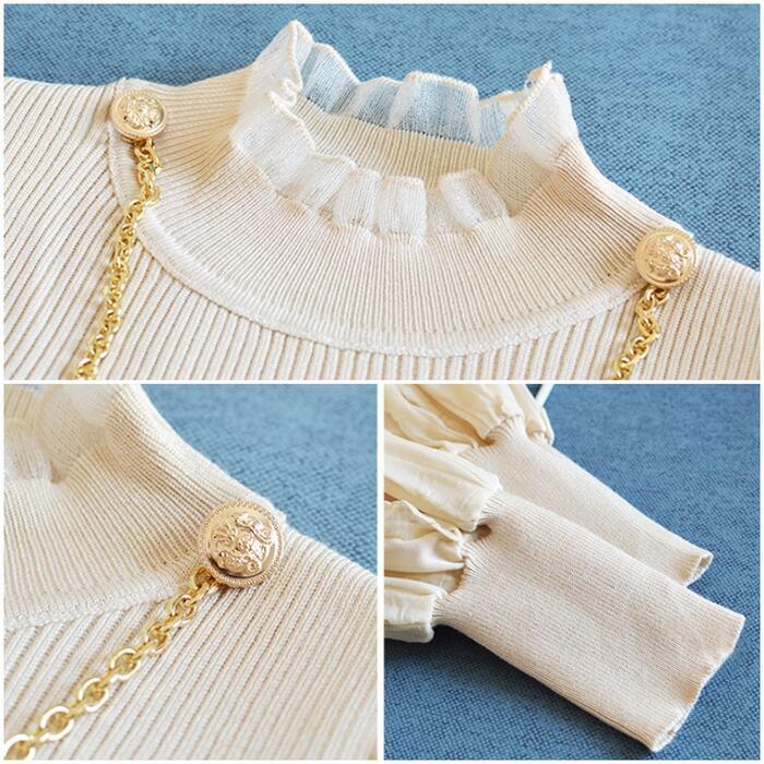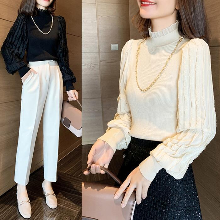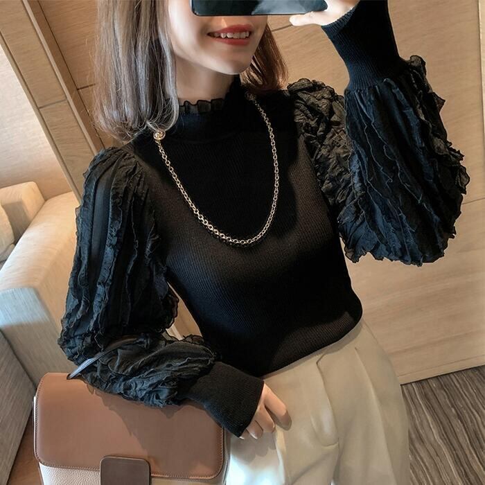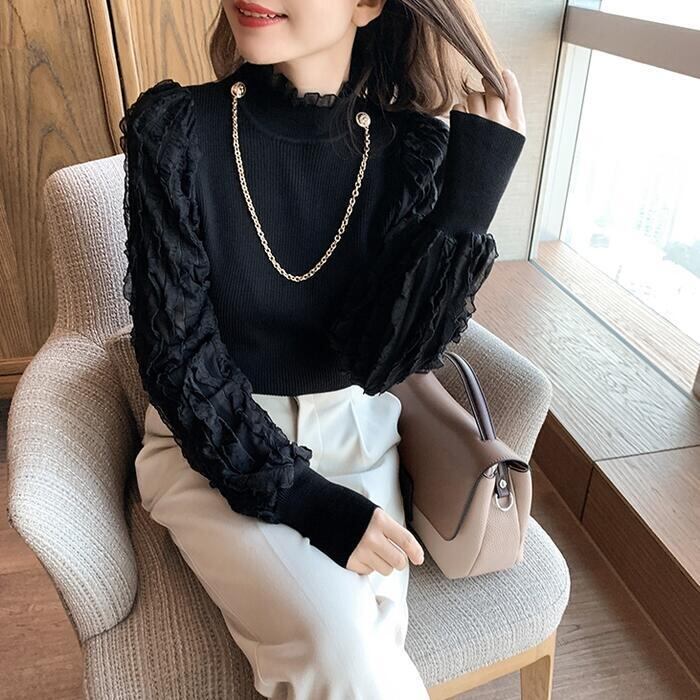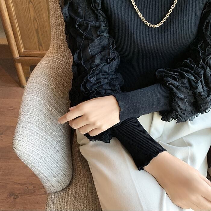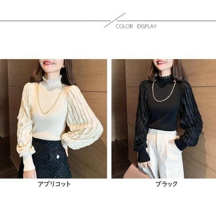 全2色 ニット トップス ランタンスリーブ ハイネック フリル チェーン カットソー エレガント レディース カジュアル おしゃれ 長袖 きれいめ お呼ばれ パフスリーブ フェミニン ブラック 黒 ベージュ 春 秋 冬 20代 30代 40代 50代