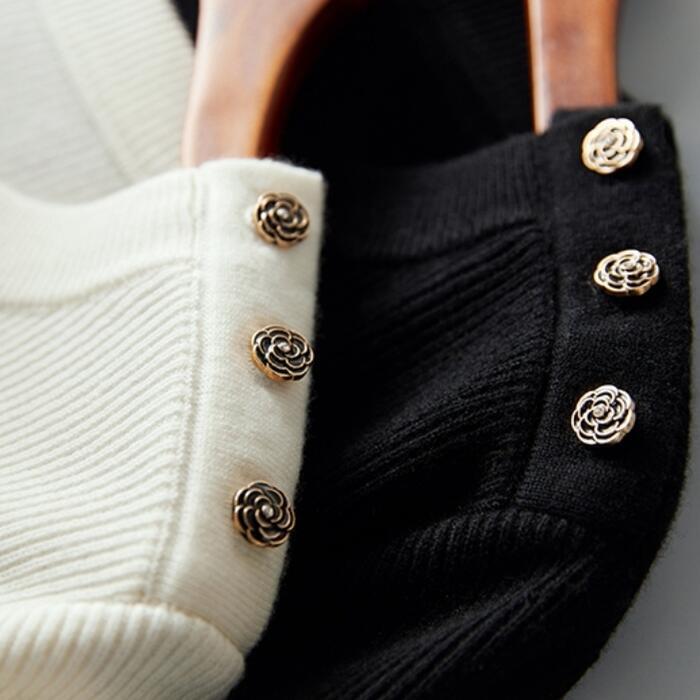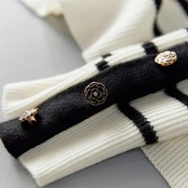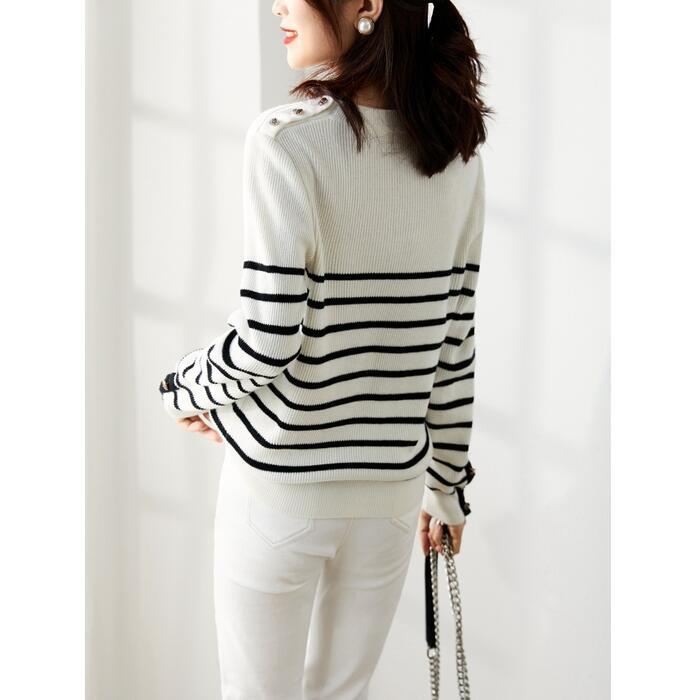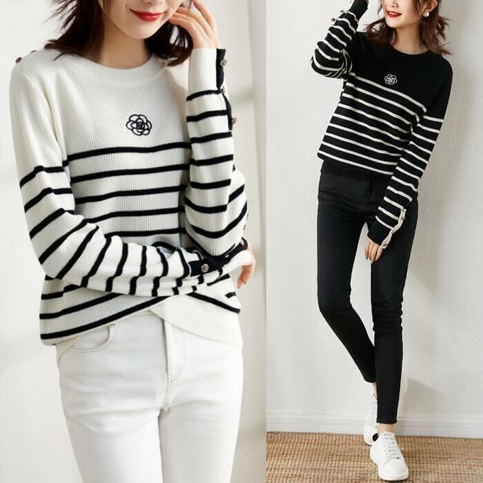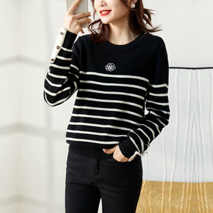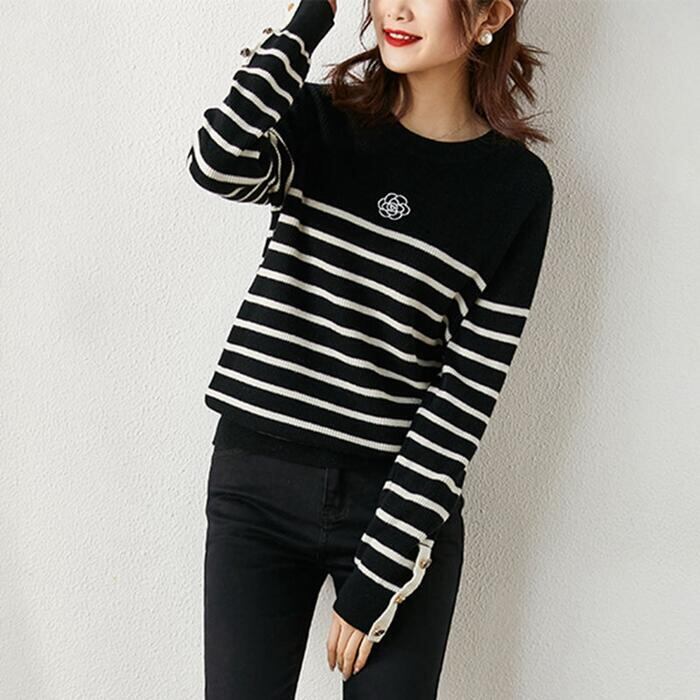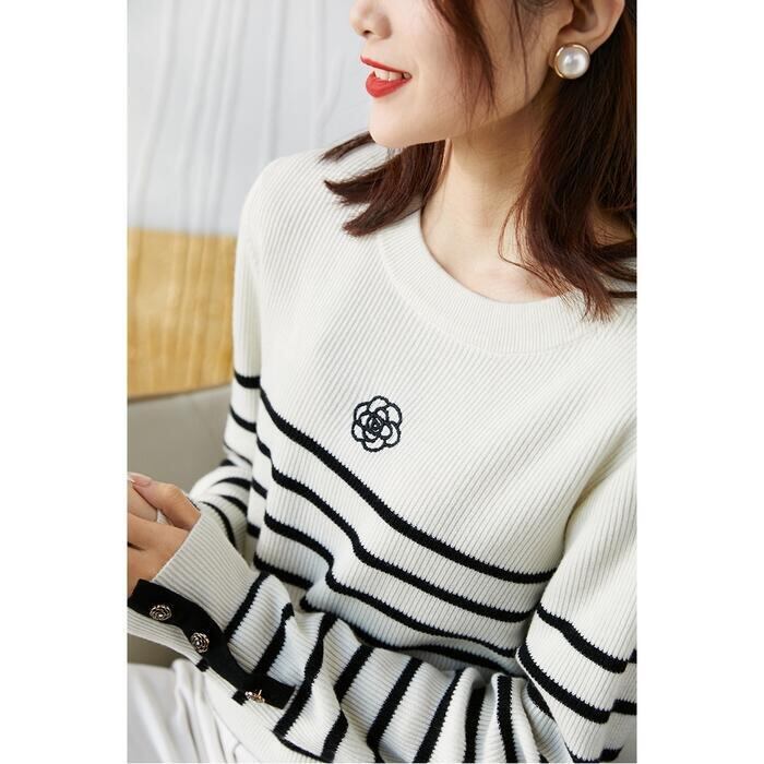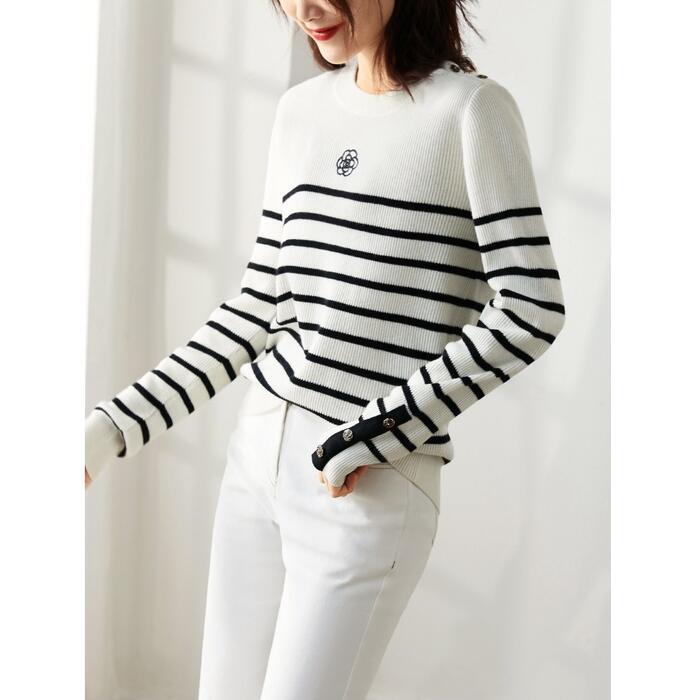全2色 ニット トップス セーター ボーダー レディース きれいめ カジュアル おしゃれ 長袖 大人可愛い フェミニン 刺繍 クルーネック エレガント 通勤 ホワイト 白 ブラック 黒 春 秋 冬 20代 30代 40代 50代