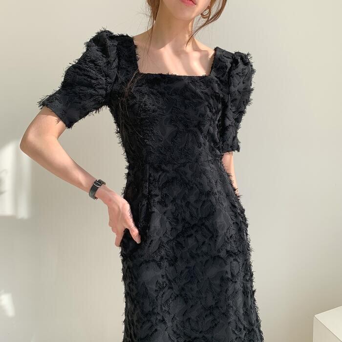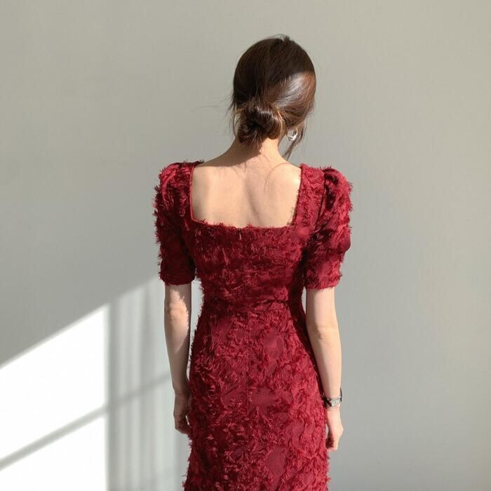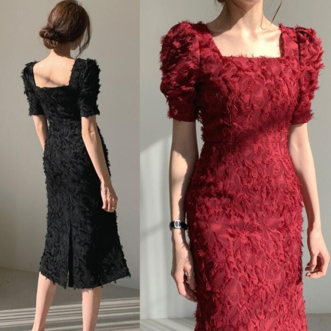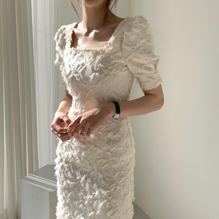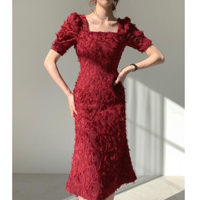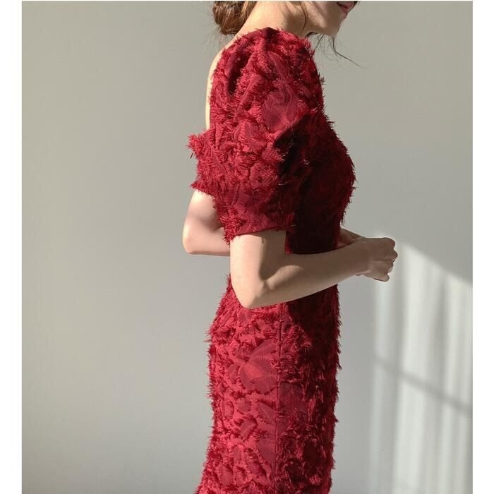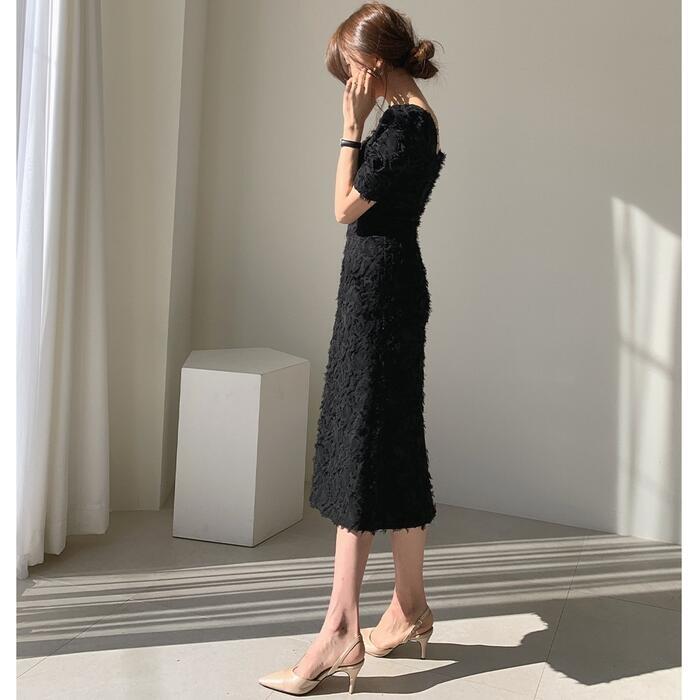 全3色 フェミニン エレガント結婚式 ワンピース ロングワンピ 袖あり パフスリーブ フェザー ミモレ丈 きれいめ レディース ワンピ ドレス 半袖 フォーマル セレモニー 発表会 大人可愛い おしゃれ パーティー ベージュ ブラック 黒 レッド 春 秋 冬 20代 30代 40代 50代