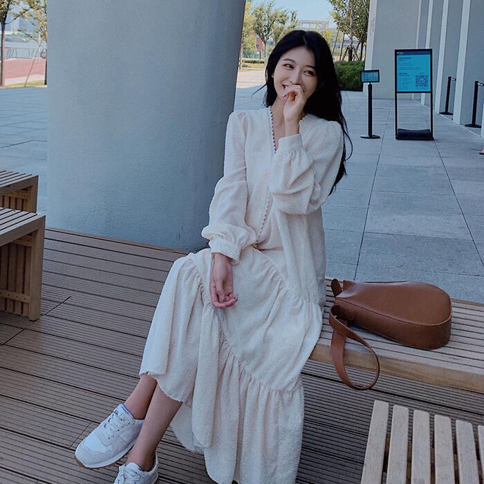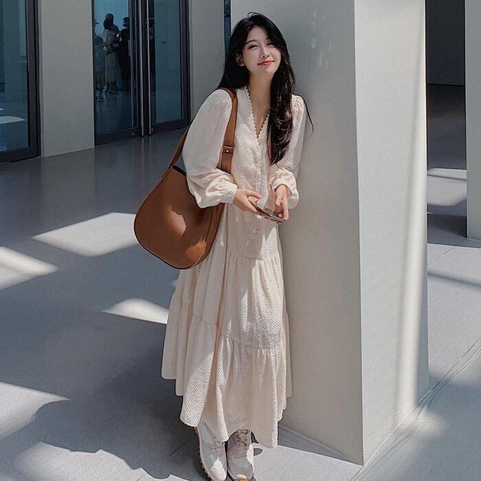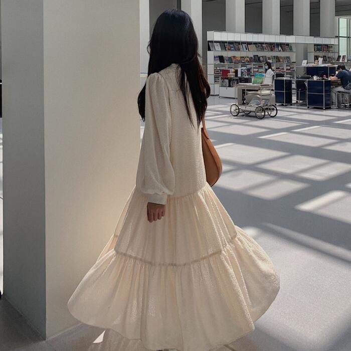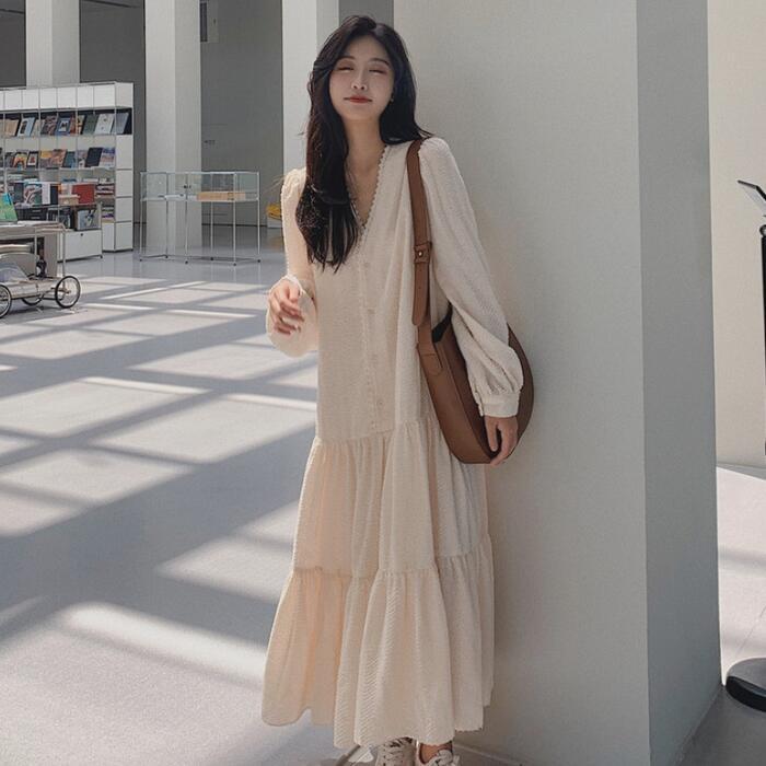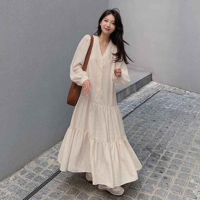 大きいサイズティアード ワンピース ロングワンピ ロング丈 パフスリーブ きれいめ カジュアル レディース ワンピ ドレス 長袖 シンプル Vネック おしゃれ 切り替え 大人可愛い ナチュラル ゆったり 体型カバー ベージュ 春 秋 冬 20代 30代 40代 50代
