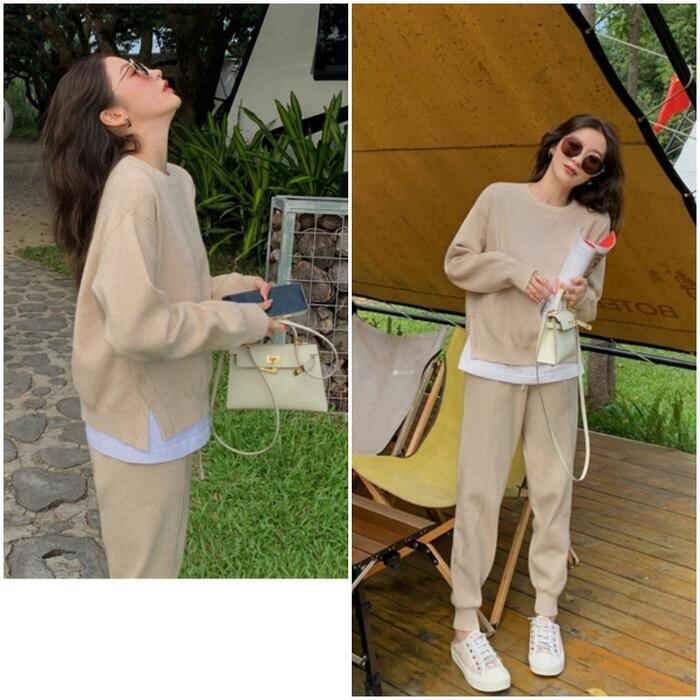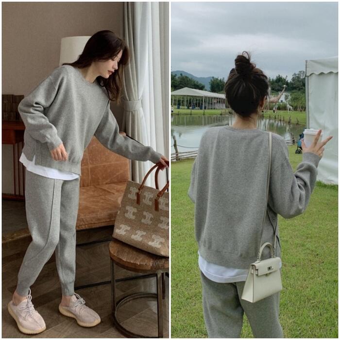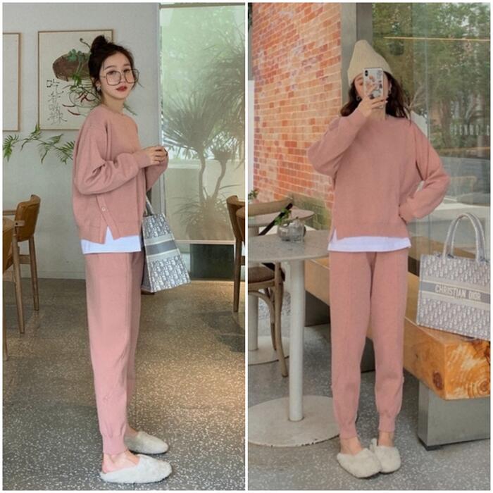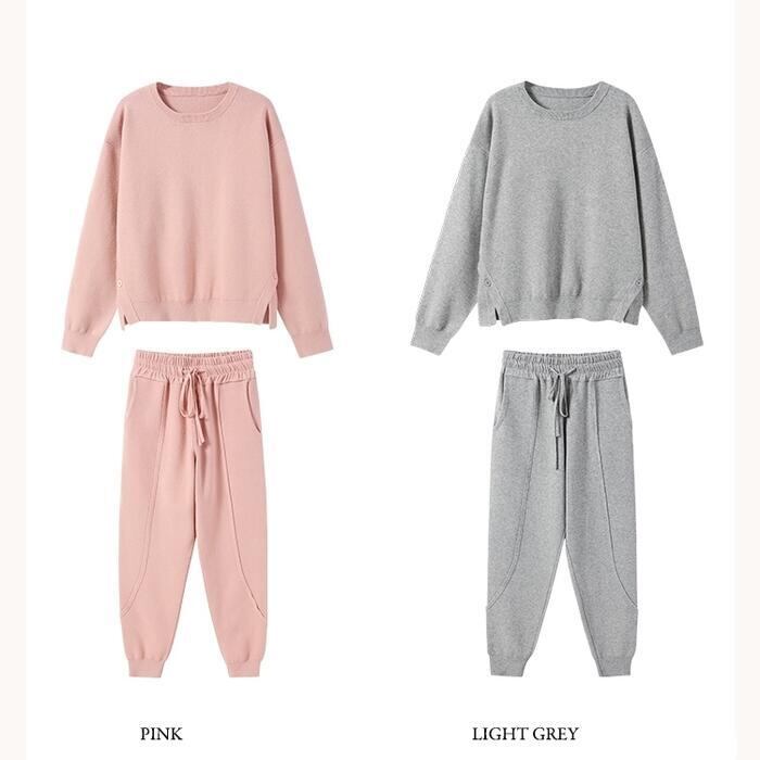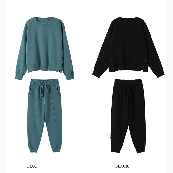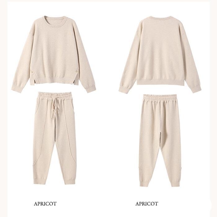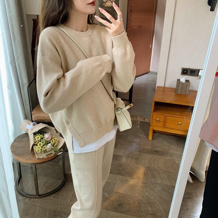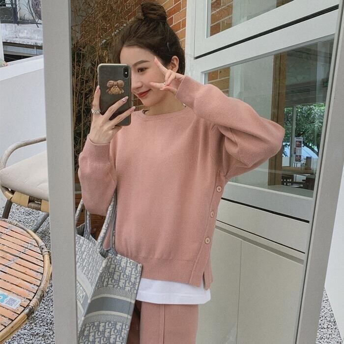 サイドボタンがポイントのニットトップス&パンツのセット。