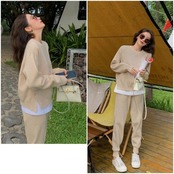 全5色 大きいサイズレイヤード セットアップ 2点セット ニット トップス パンツ スポーティ リラックス 長袖 楽ちん カジュアル リラックス ロングパンツ ウエストゴム 大人可愛い ピンク ブルー ベージュ グレー ブラック 黒 春 秋 冬 20代 30代 40代 50代