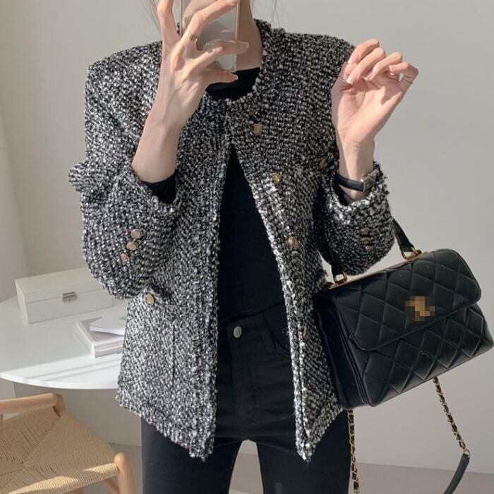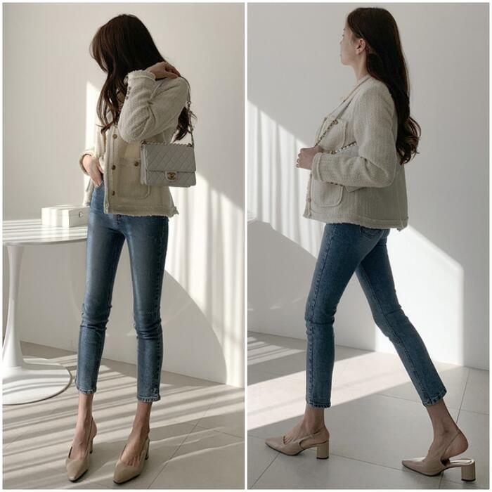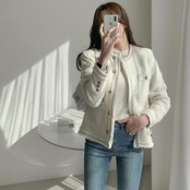 ツイード調の生地が高見えするノーカラージャケット。