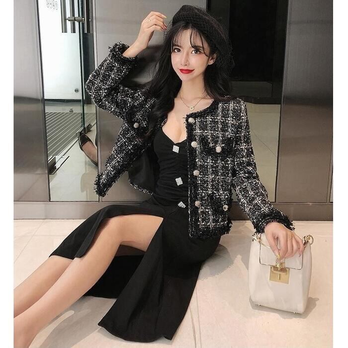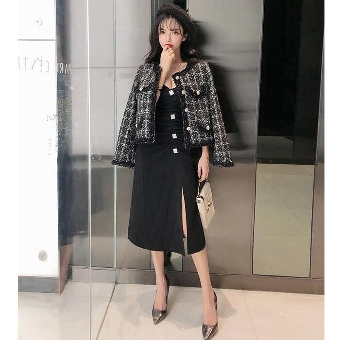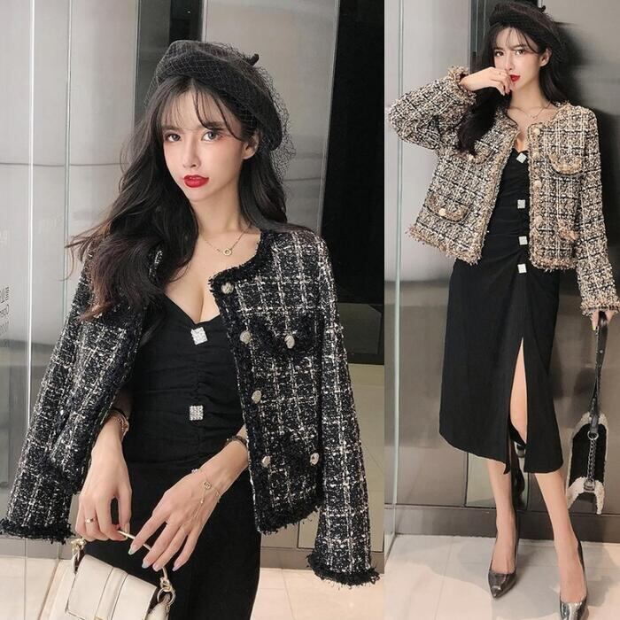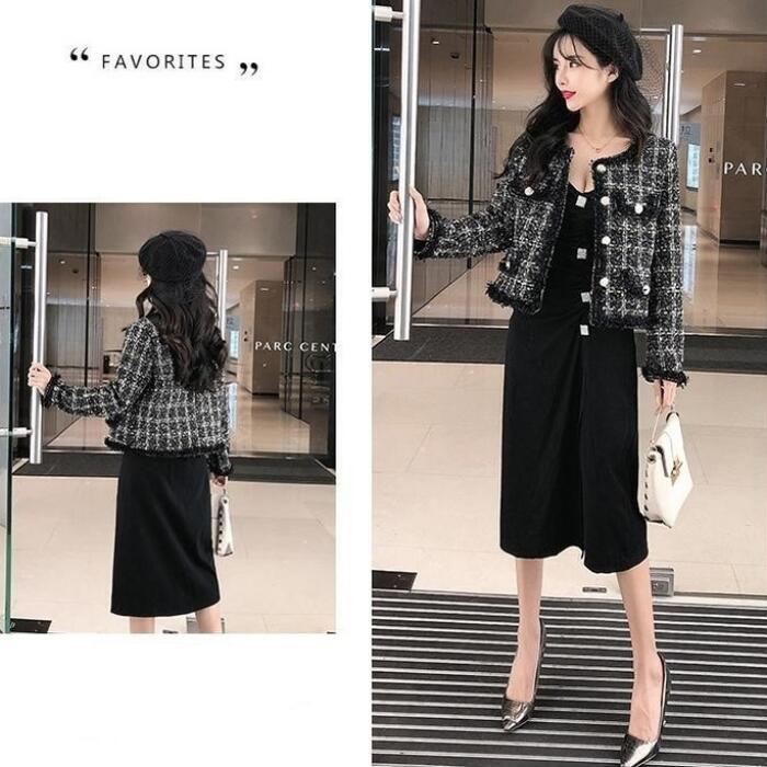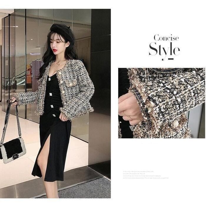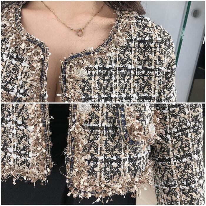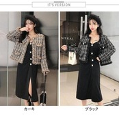 全2色 ジャケット コート ツイード アウター ノーカラー チェック柄 レディース きれいめ カジュアル おしゃれ 長袖 エレガント 大人可愛い フェミニン シンプル オフィス お呼ばれ デート 通勤 クラシカル カーキ ブラック 黒 春 秋 冬 20代 30代 40代 50代