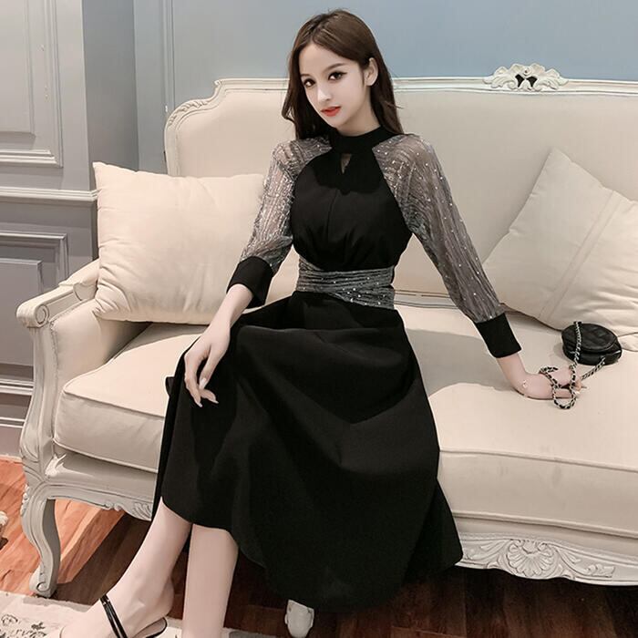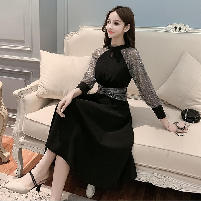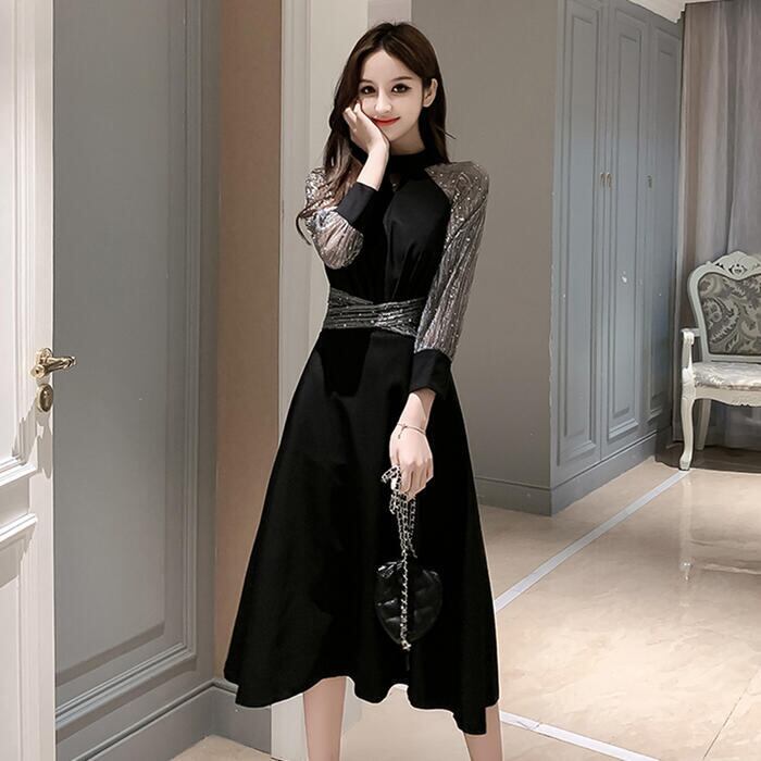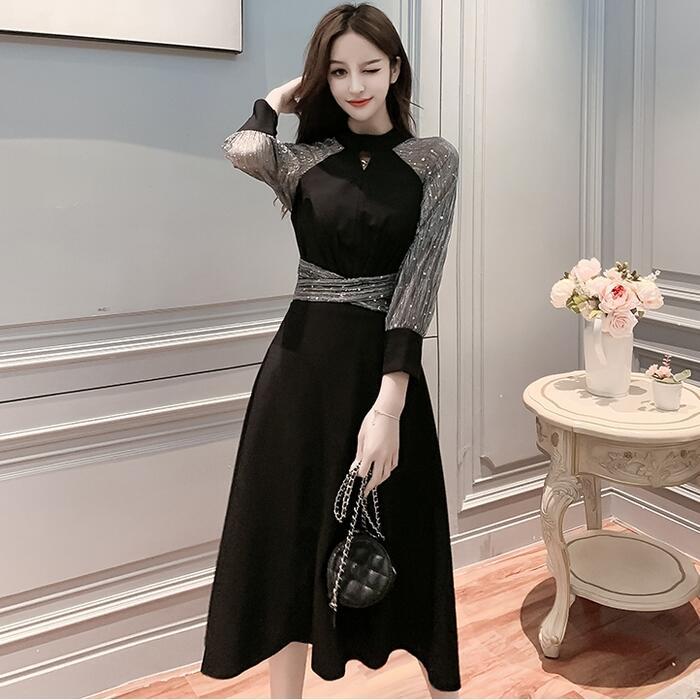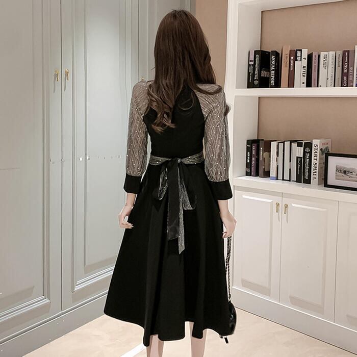 大きいサイズ結婚式 ワンピース ロングワンピ 袖あり ウエストリボン エレガント ラメ ミモレ丈 透け感 きれいめ レディース ワンピ ドレス 七分袖 フォーマル セレモニー 発表会 大人可愛い 二次会 パーティー シアー ブラック 黒 春 秋 夏 20代 30代 40代 50代