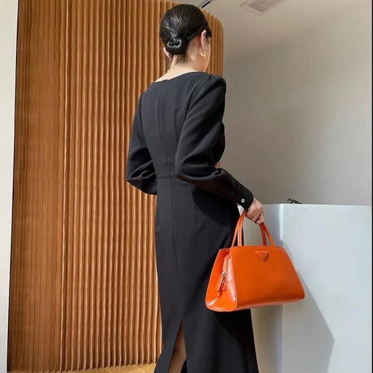 立体的なデザインが目を惹くミモレ丈ワンピース。