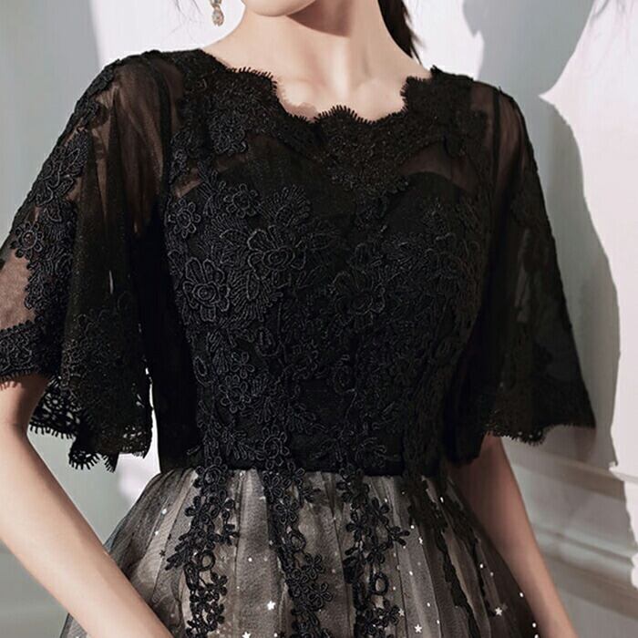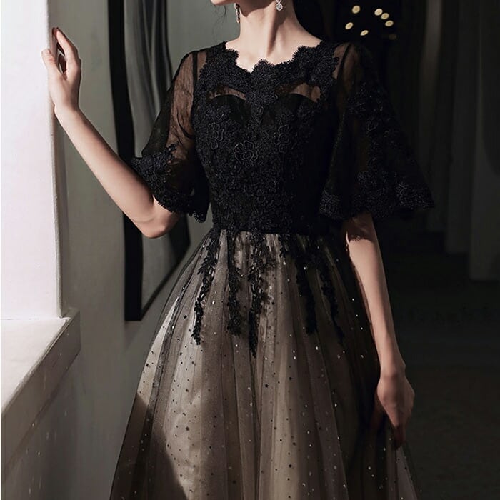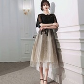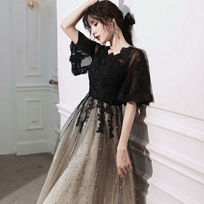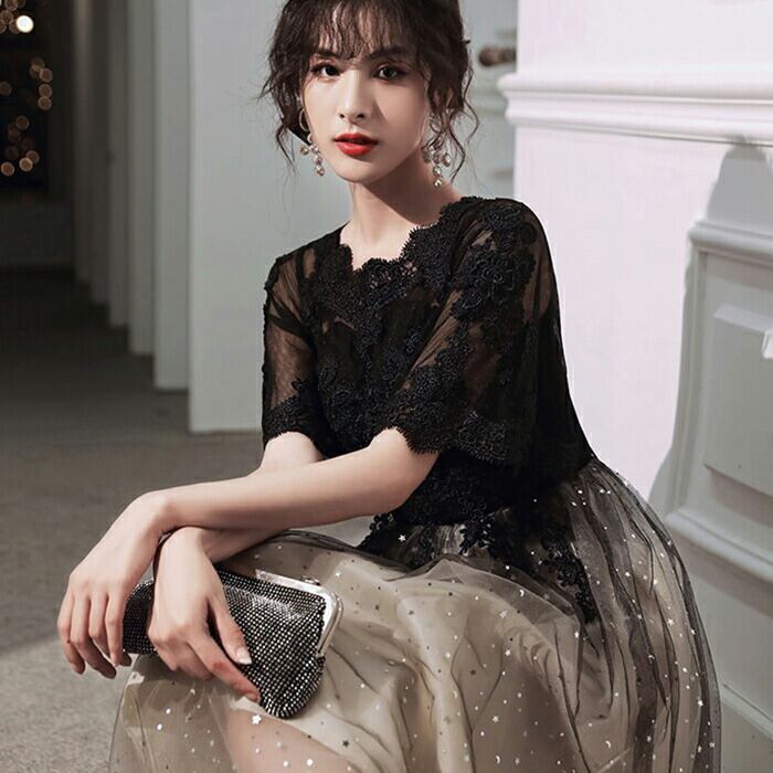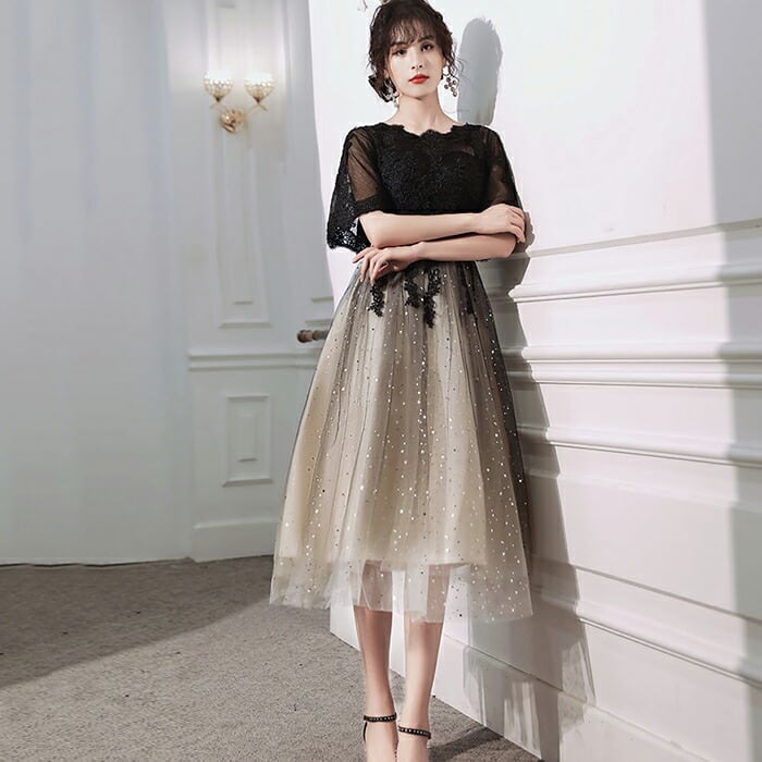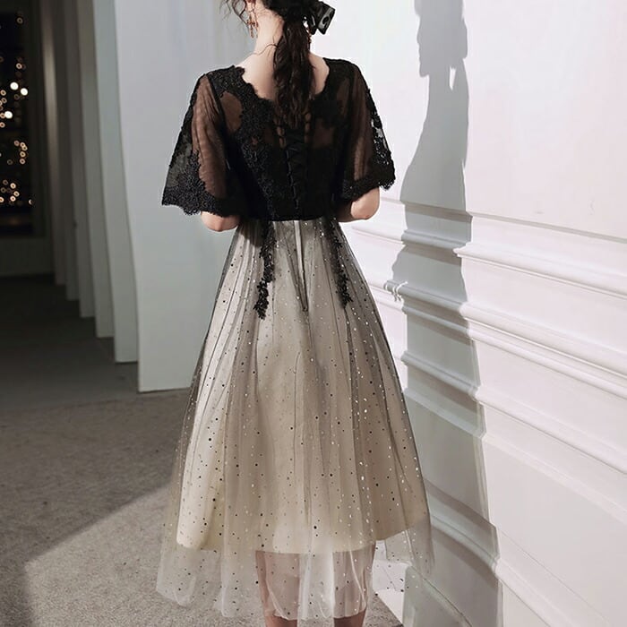 レースとチュール、スパンコールが華やかなミモレ丈ワンピース。