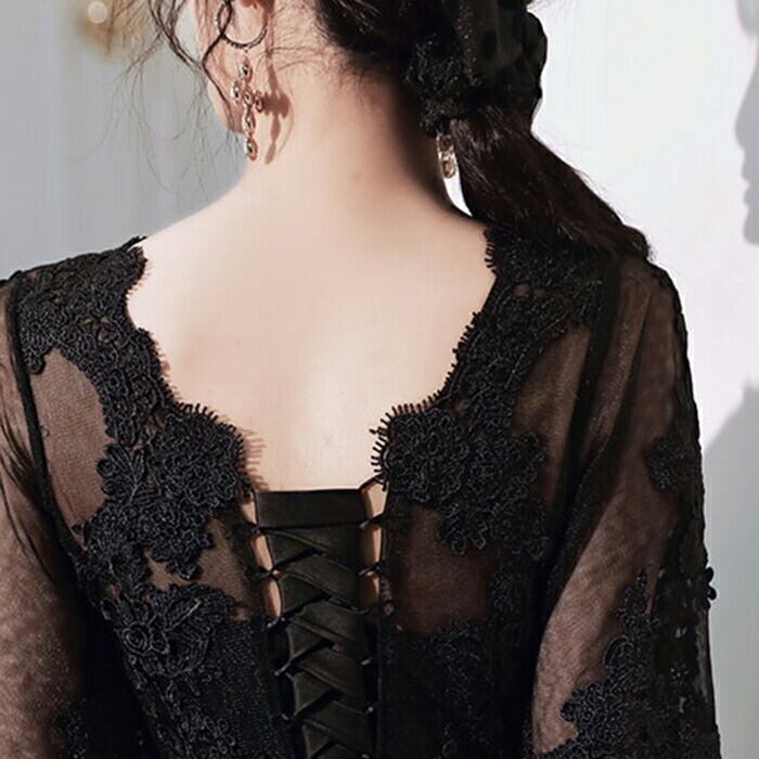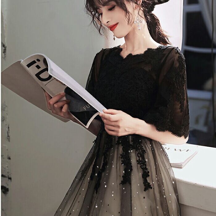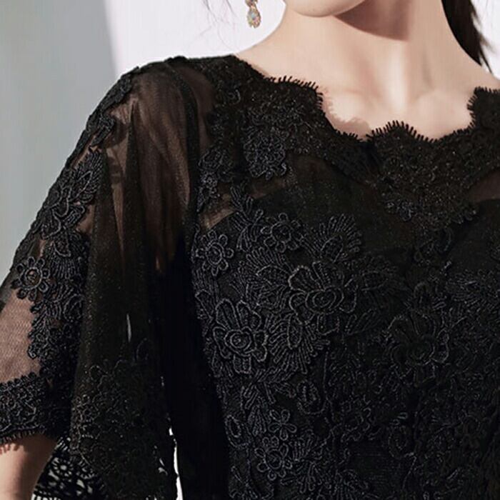 大きいサイズ結婚式 ワンピース パーティ 袖あり エレガント レース シアー 花柄 ミモレ丈 きれいめ レディース ワンピ ドレス フレア 透け感 フォーマル セレモニー 発表会 大人可愛い クラシカル 二次会 ブラック 春 秋 冬 20代 30代 40代 50代