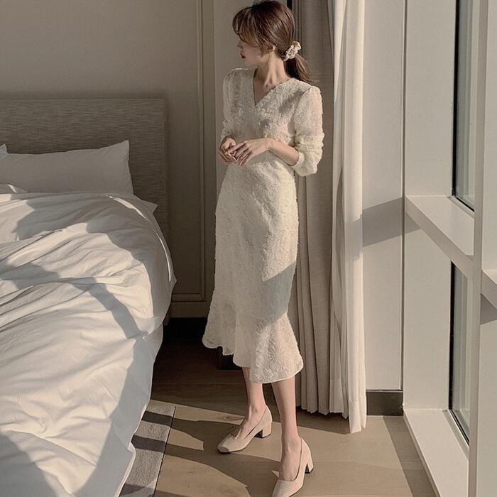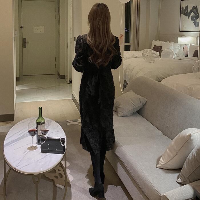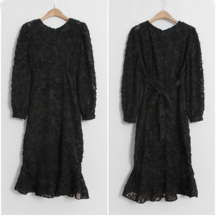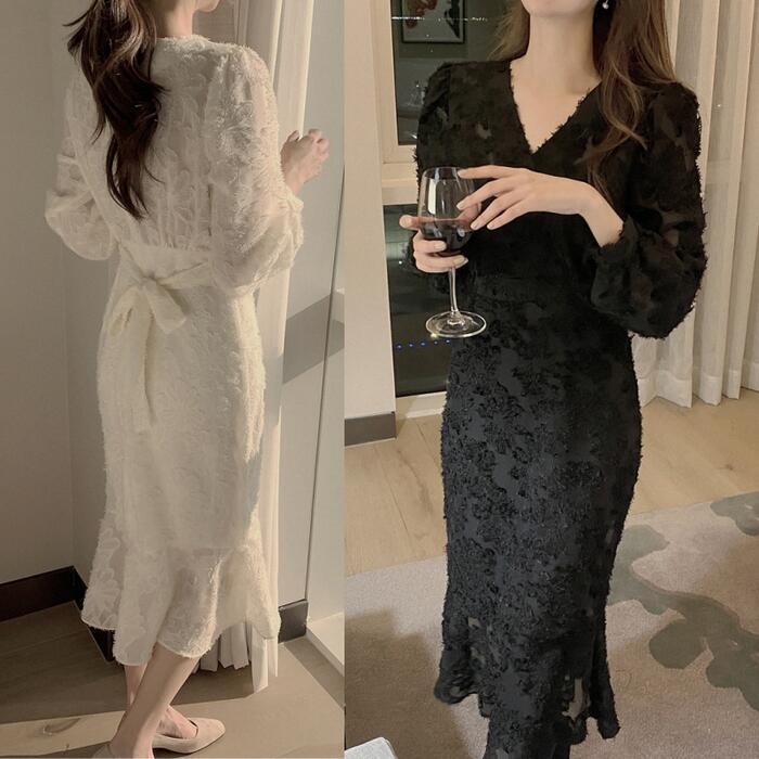 全2色 結婚式 ワンピース ロングワンピ 袖あり エレガント Vネック シアー 花柄 ミモレ丈 きれいめ レディース ワンピ ドレス 長袖 フレア 透け感 フォーマル セレモニー 発表会 大人可愛い 二次会 ベージュ ブラック 黒 春 秋 冬 20代 30代 40代 50代