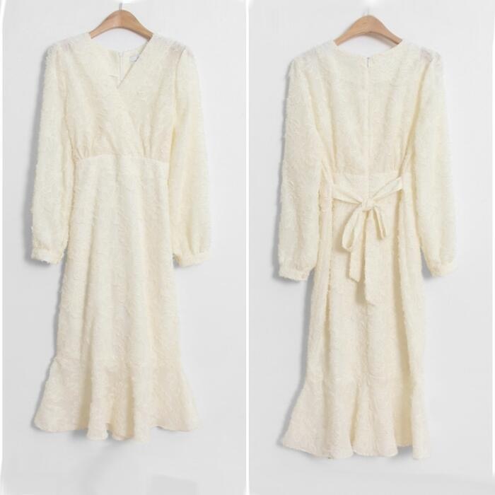 バックリボンやフレアな裾が女性らしさ溢れるデザイン。