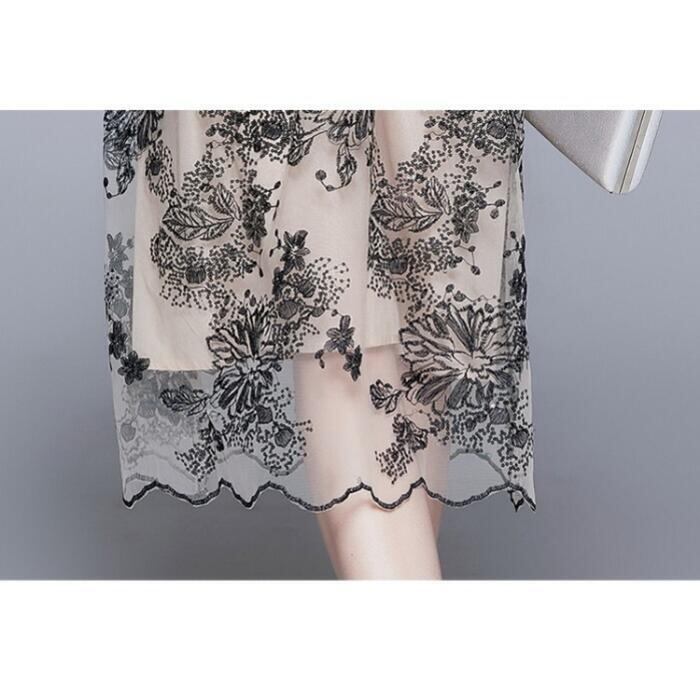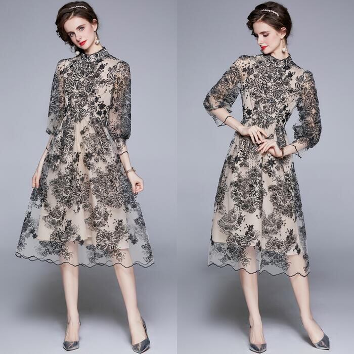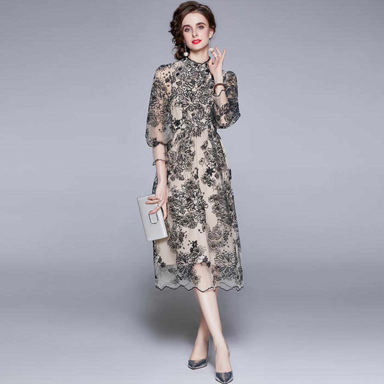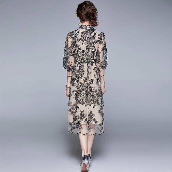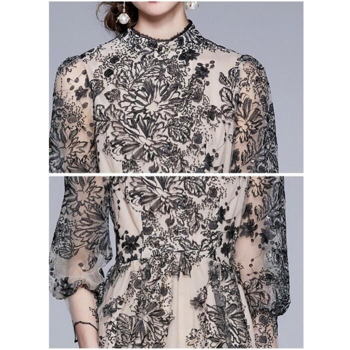 シアー素材に優美な刺繍を施したエレガントなワンピース。