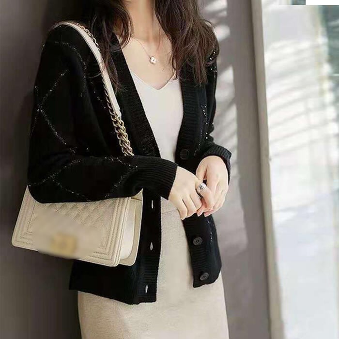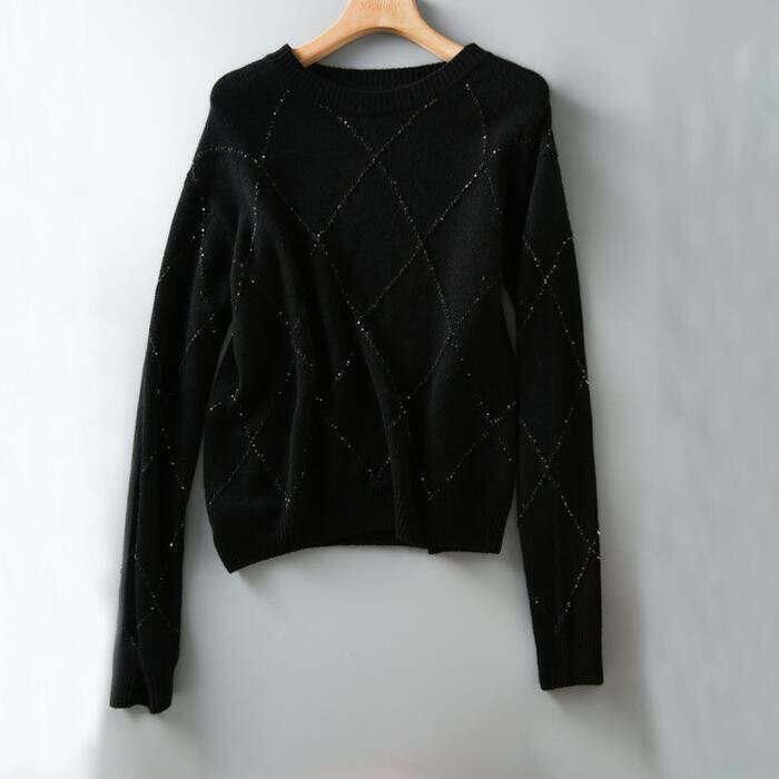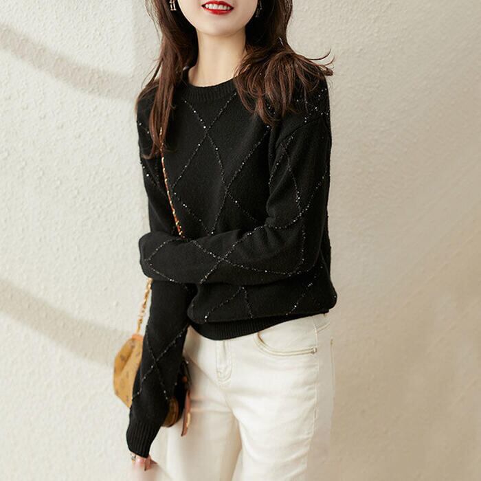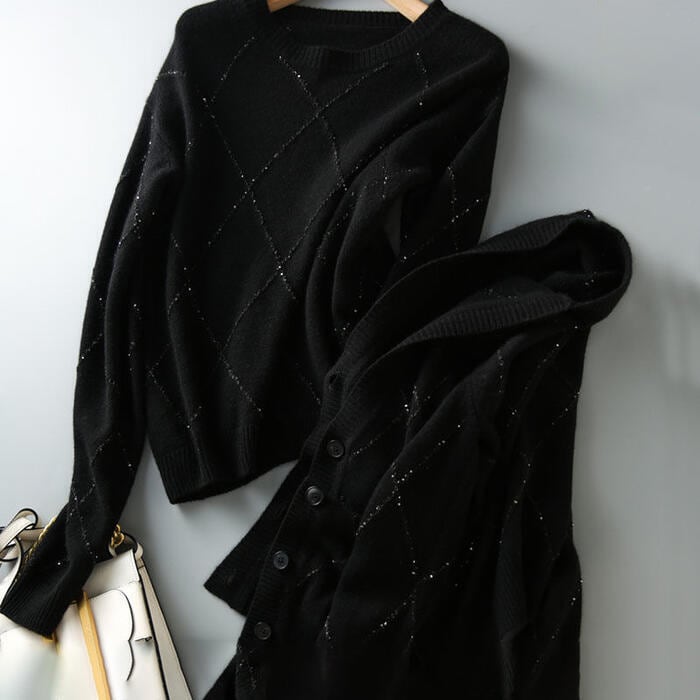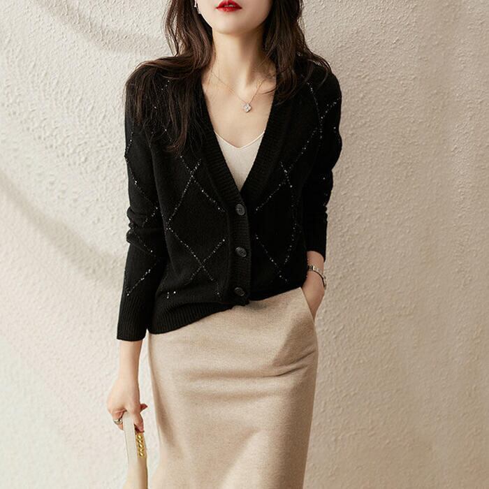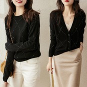 ダイヤ柄のニットカーディガンとクルーネックトップス。