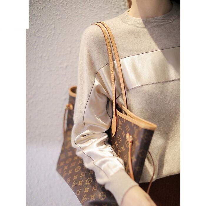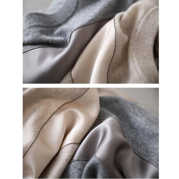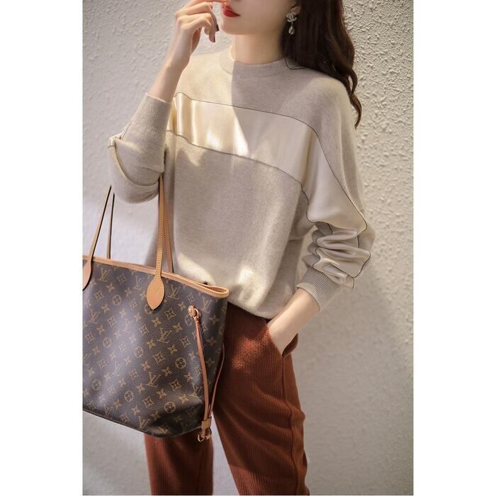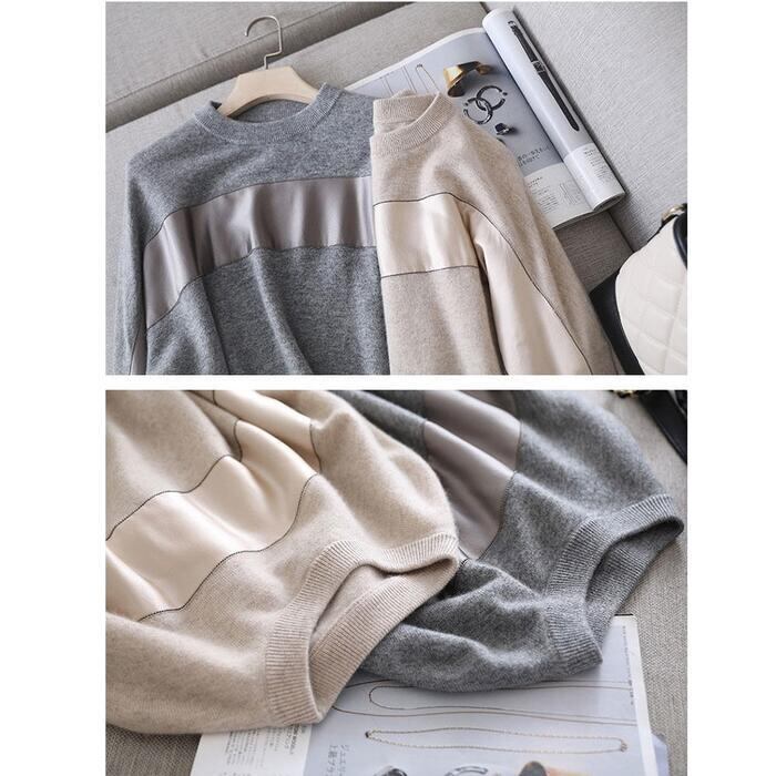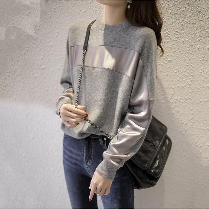 全2色 トップス ニット セーター 切り替え 長袖 レディース カジュアル おしゃれ 異素材MIX クルーネック きれいめ フェミニン シンプル ゆったり 通勤 大きいサイズ 大人可愛い ベージュ グレー 春 秋 冬 20代 30代 40代 50代