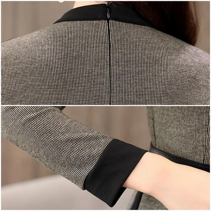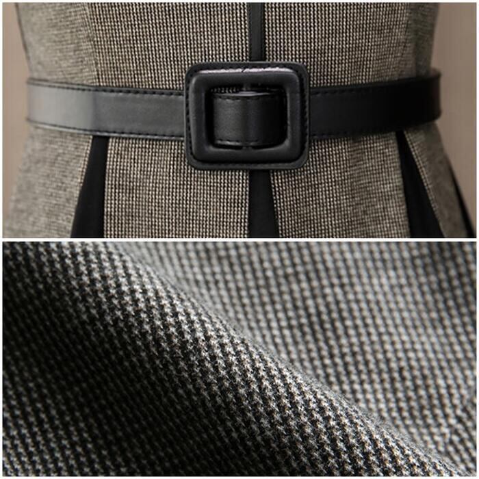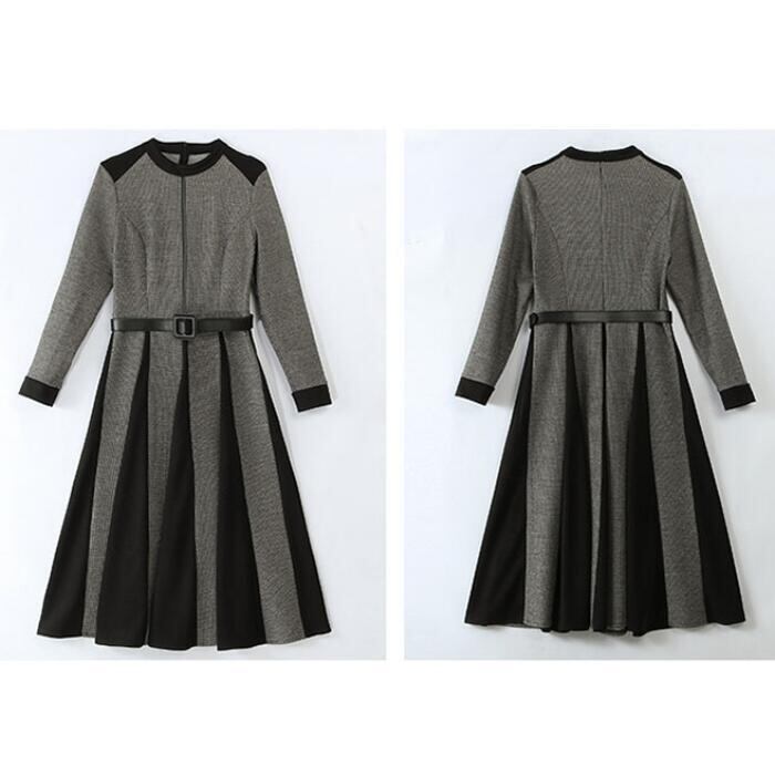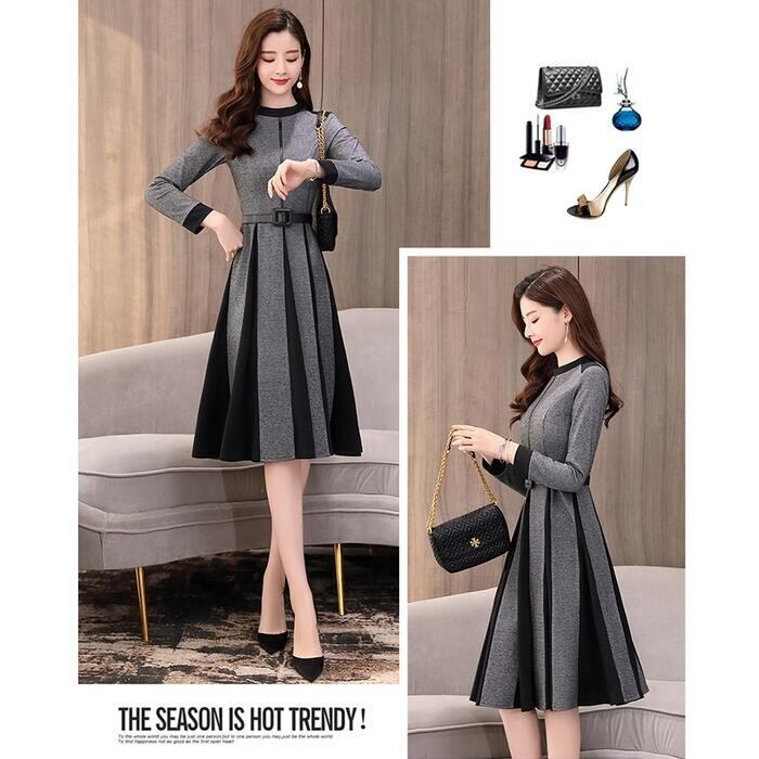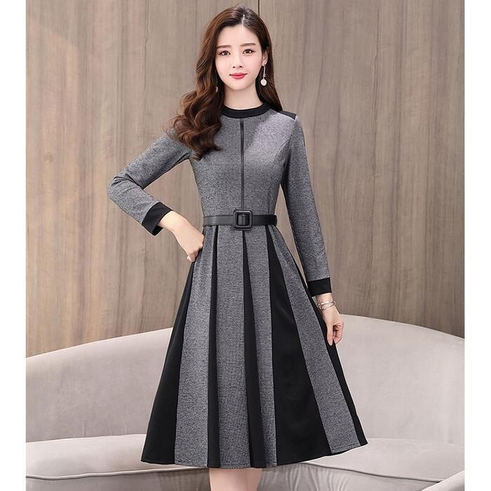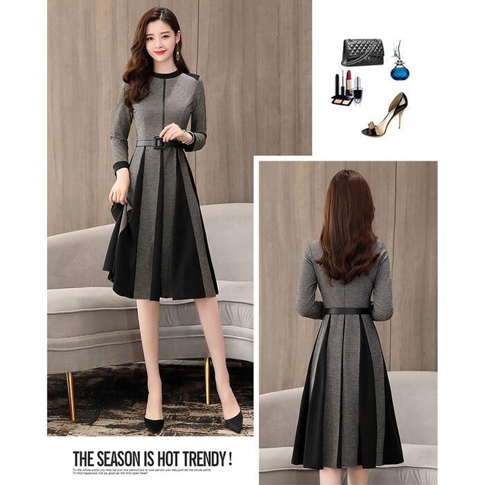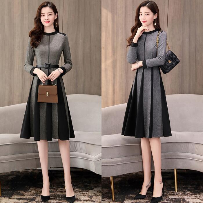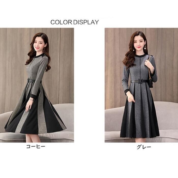 全2色 ワンピース ロングワンピ バイカラー 袖あり エレガント ひざ丈 きれいめ レディース ワンピ ドレス 長袖 カジュアル 大人可愛い Aライン 楽ちん 体系カバー ハイウエスト お呼ばれ 大きいサイズ ブラウン グレー 黒 春 秋 夏 20代 30代 40代 50代