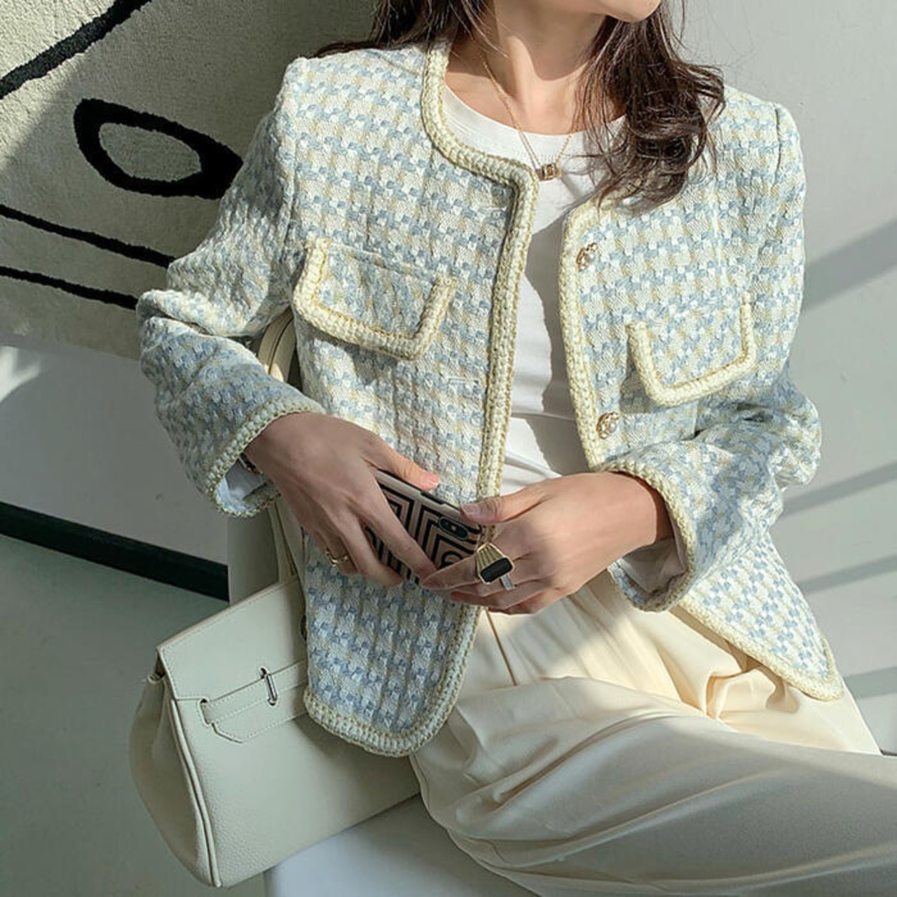 全2色 ノーカラージャケット ツイード チェック レディース きれいめ カジュアル ジャケット アウター コート 長袖 大人 可愛い フェミニン お呼ばれ オケージョン 通勤 大きいサイズ ベージュ ブルー 青 春 秋 冬 20代 30代 40代 50代